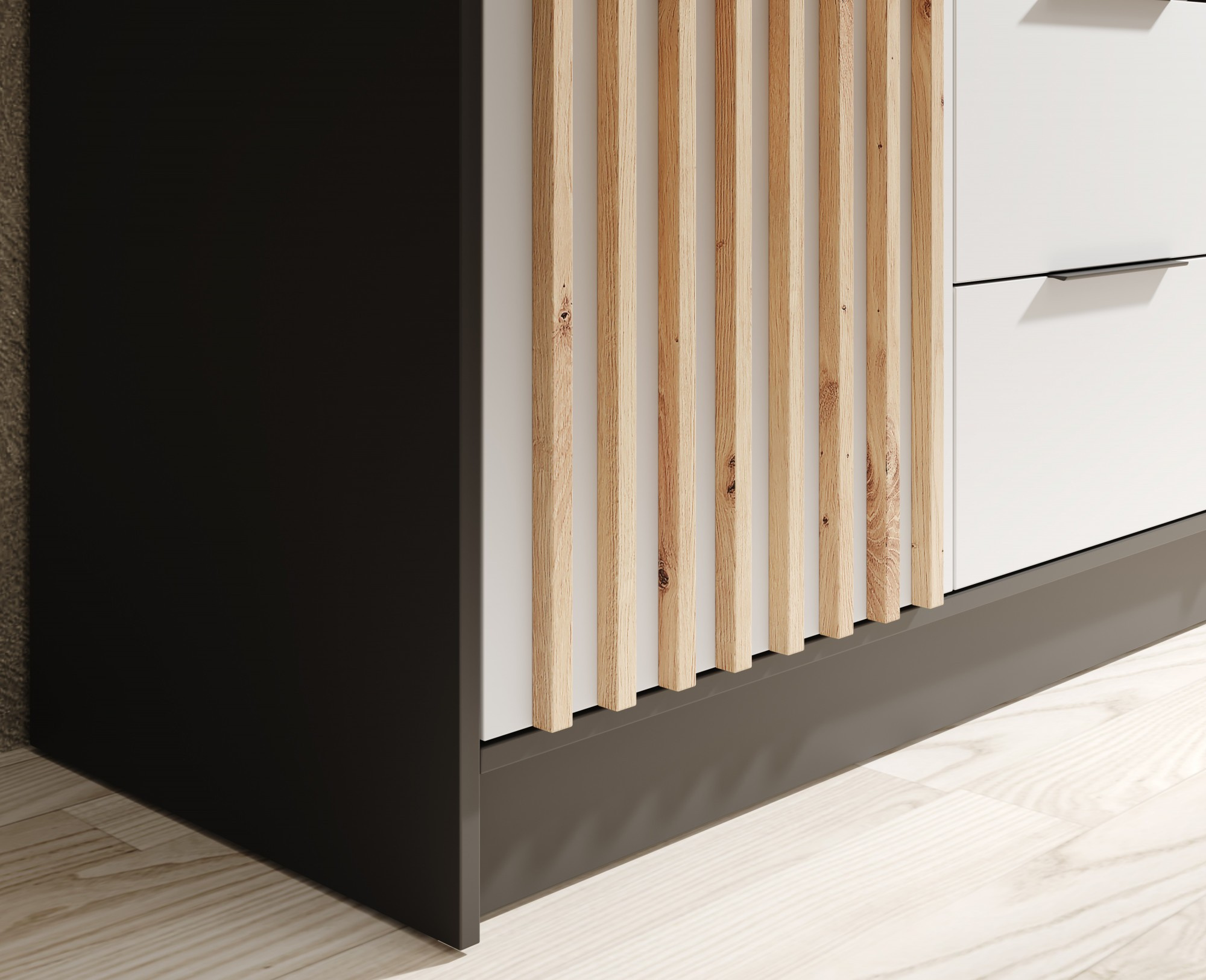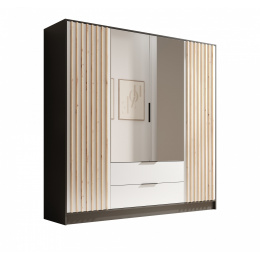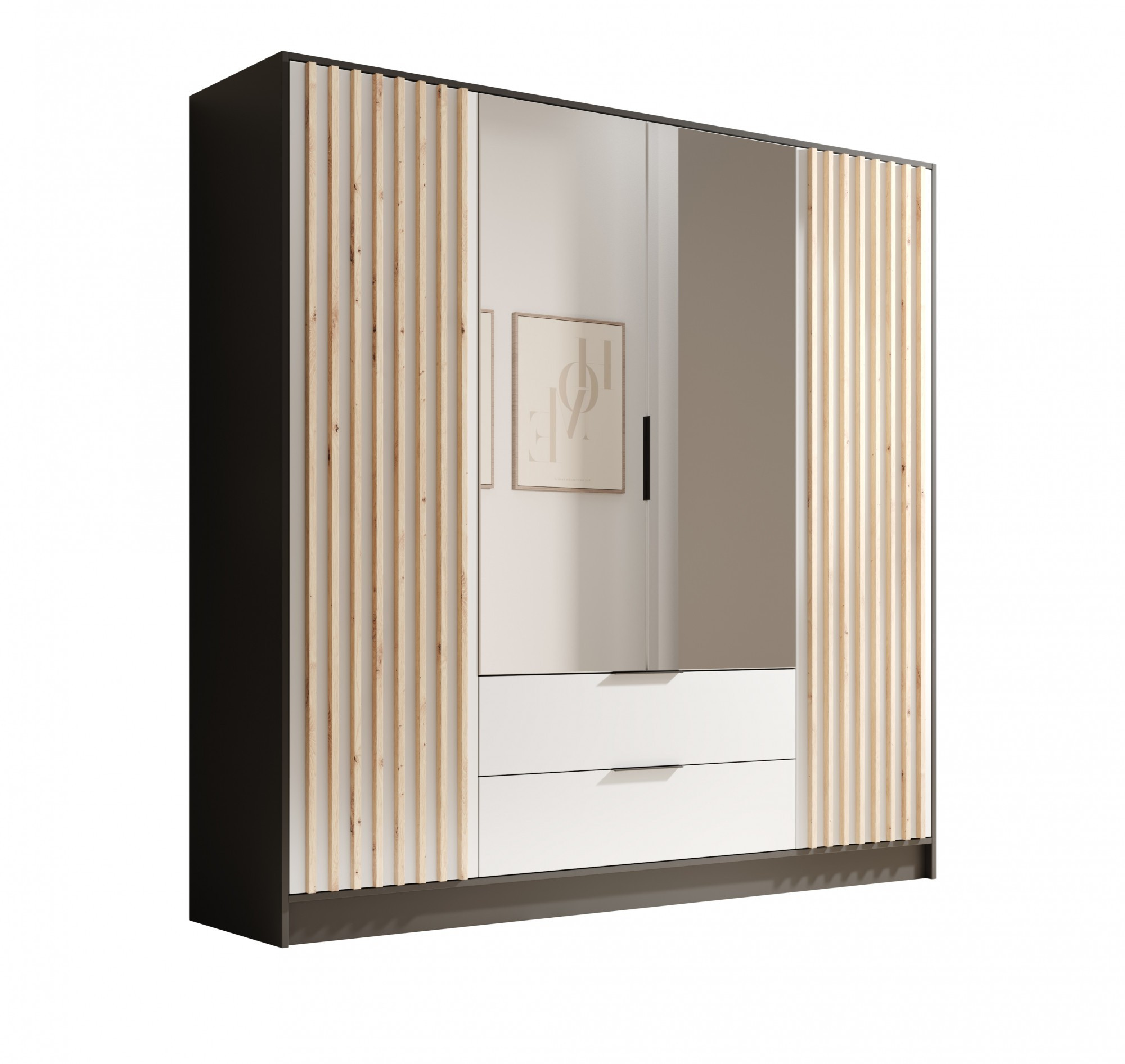 Šatní skříň Neri – elegantní a funkční skříň, která se dokonale hodí do moderních i klasických interiérů. Díky široké škále barev si každý najde verzi, která dokonale ladí s jeho stylem. Skříň Neri se vyznačuje dekorativními lamelami na čelních stranách a velkým zrcadlem, které opticky zvětší prostor a dodá mu lehkost.Skříň je k dispozici ve třech praktických velikostech:- 100 cm – kompaktní, ideální pro menší prostory,- 150 cm – vynikající kompromis mezi prostorem a velikostí,- 200 cm – prostorná varianta, ideální pro uložení většího šatníku.Každá z verzí byla navržena s ohledem na pohodlí uživatele a estetiku, která obohatí každou ložnici nebo šatnu.