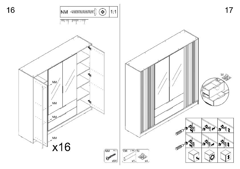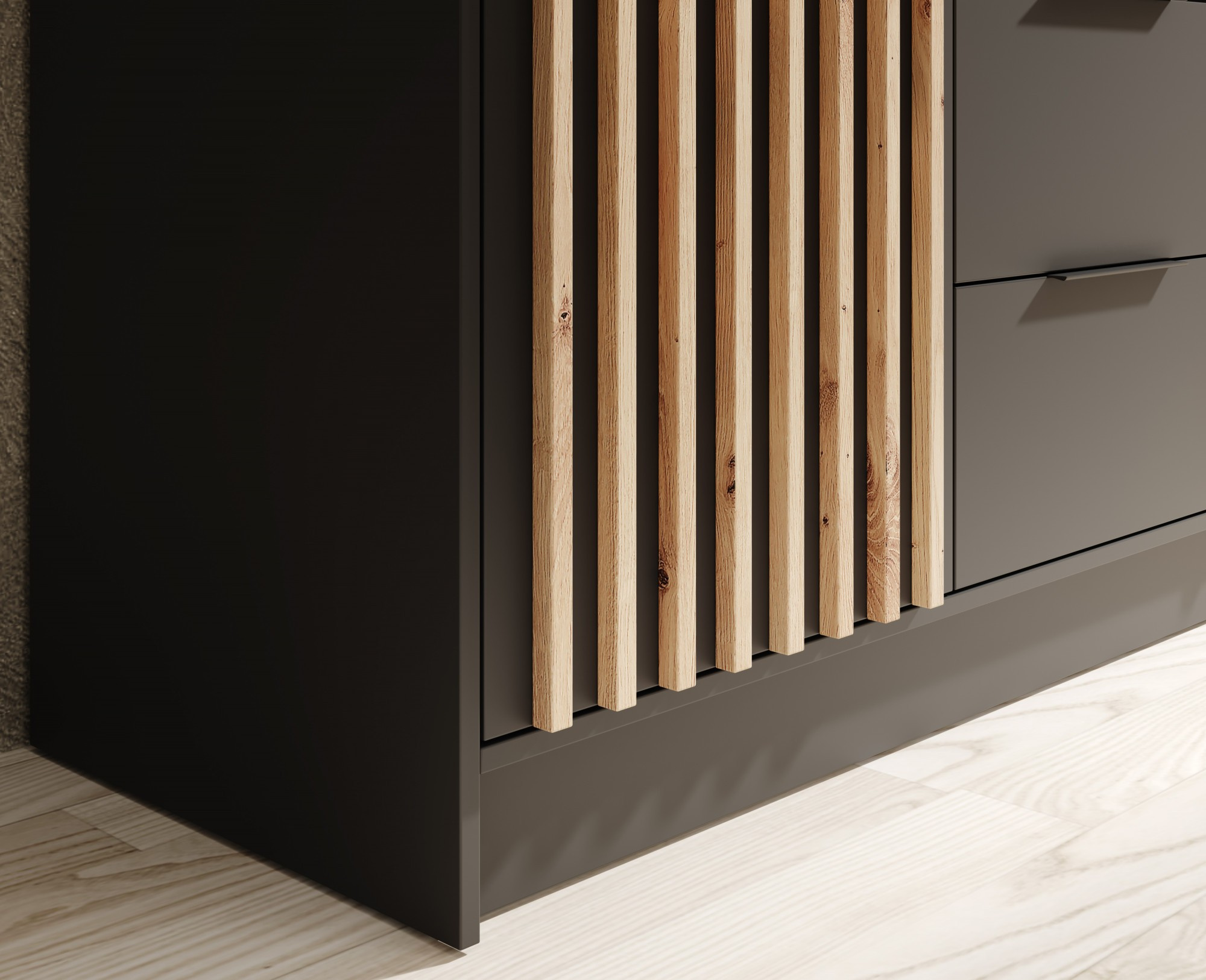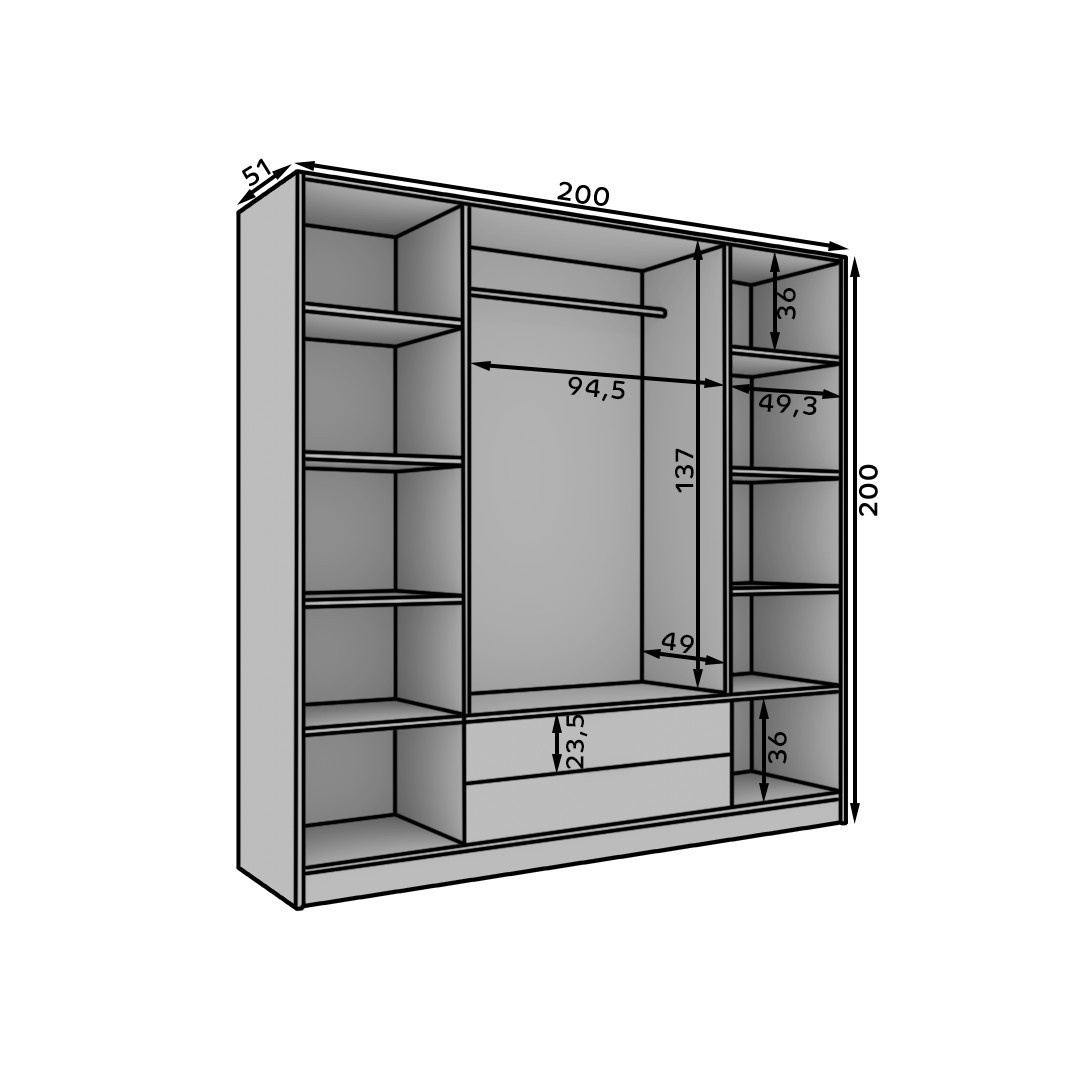 Šatní skříň Neri – elegantní a funkční skříň, která se dokonale hodí do moderních i klasických interiérů. Díky široké škále barev si každý najde verzi, která dokonale ladí s jeho stylem. Skříň Neri se vyznačuje dekorativními lamelami na čelních stranách a velkým zrcadlem, které opticky zvětší prostor a dodá mu lehkost.Skříň je k dispozici ve třech praktických velikostech:- 100 cm – kompaktní, ideální pro menší prostory,- 150 cm – vynikající kompromis mezi prostorem a velikostí,- 200 cm – prostorná varianta, ideální pro uložení většího šatníku.Každá z verzí byla navržena s ohledem na pohodlí uživatele a estetiku, která obohatí každou ložnici nebo šatnu.