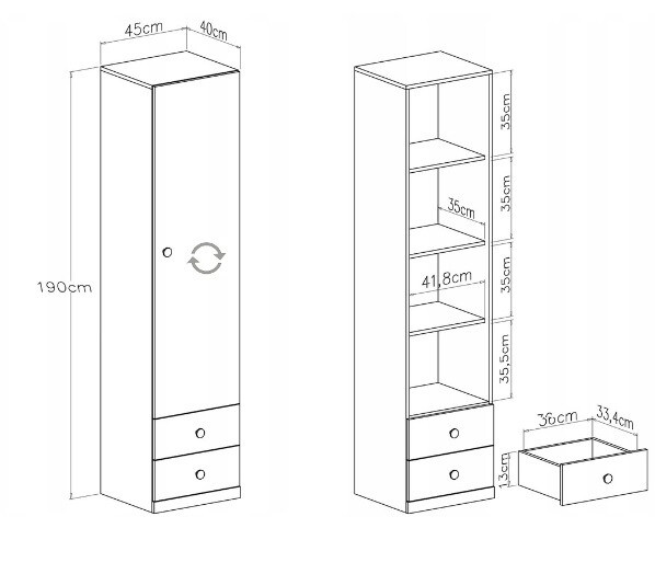 S rozměry 45 cm na šířku, 190 cm na výšku a 40 cm na hloubku je tato skříň ideální pro menší prostory, kde je potřeba efektivně využít každý centimetr. Klasické otvírání dveří zajišťuje snadný přístup k obsahu skříně, což oceníte zejména v úzkých chodbách nebo menších místnostech.