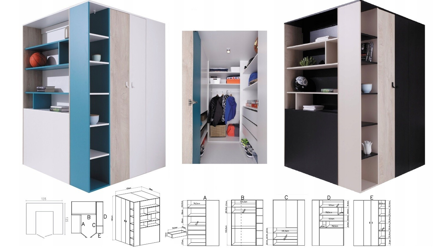 Šatní skříň PLANET- PL1 L/P, bílý lux+dub+modrá