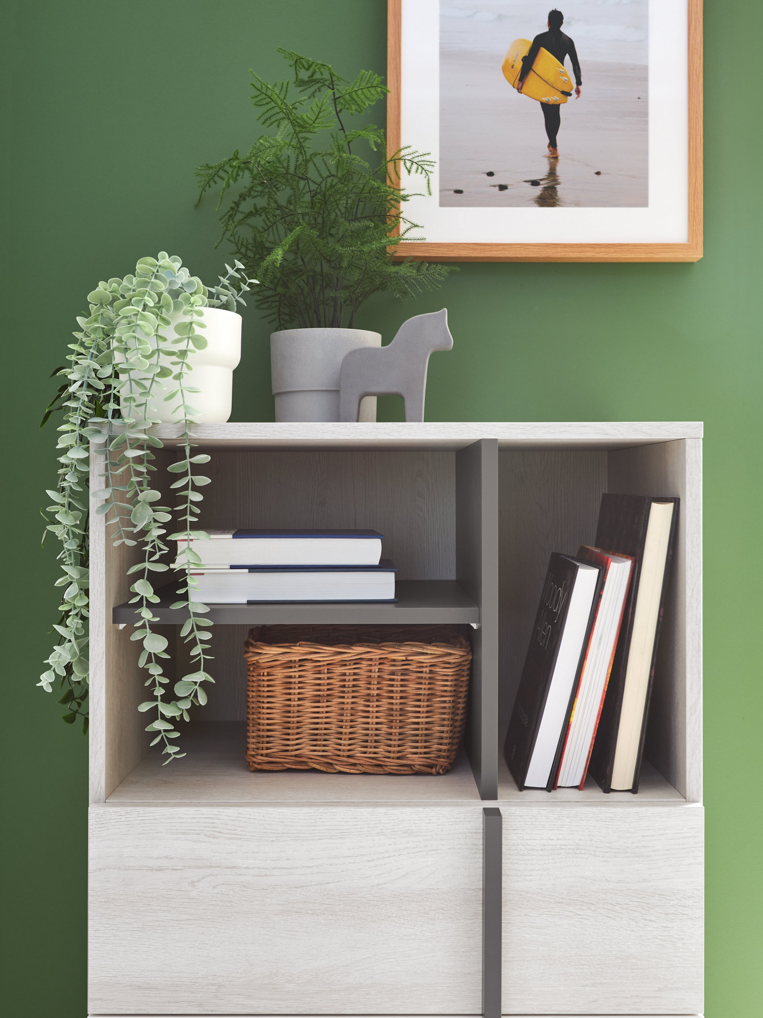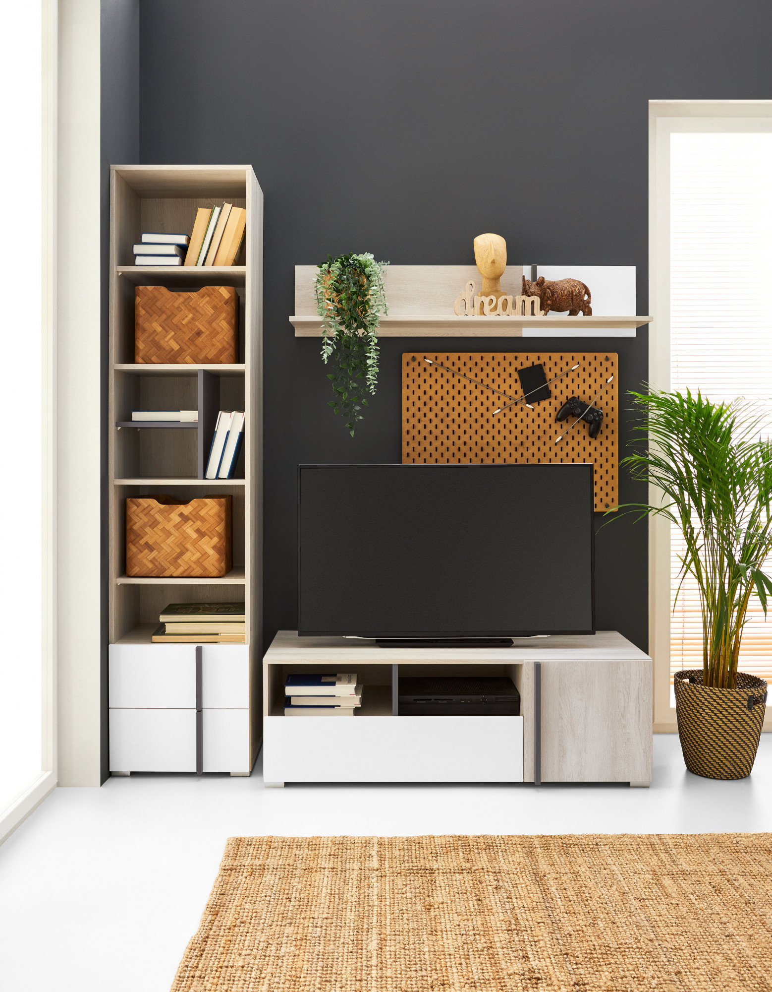 Systém REMO je vyroben v barevném provedení Dub Wilton bílý/Bílá Lux/Antracit. Korpus nábytku je vyroben v barevném odstínu Dub Wilton bílý.