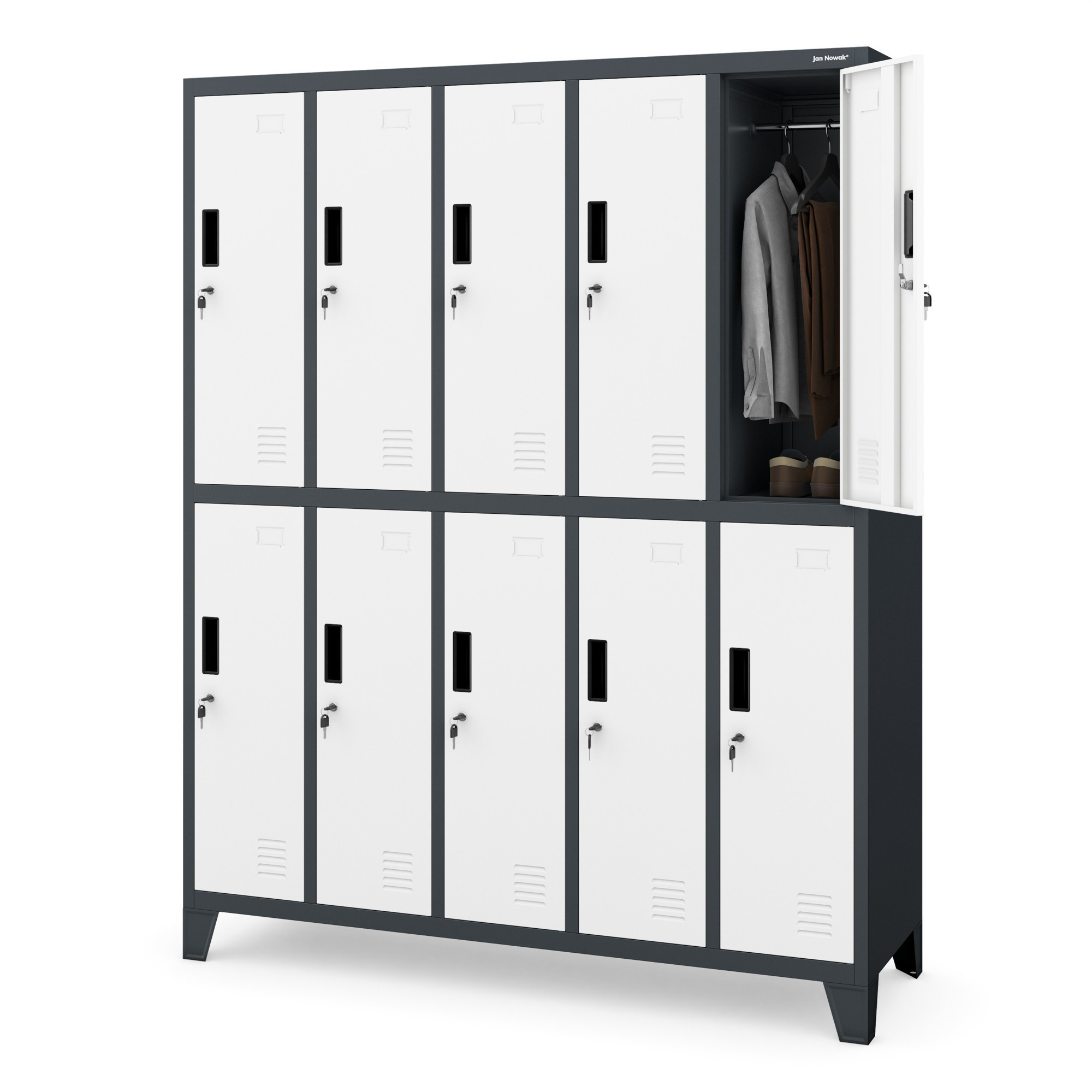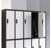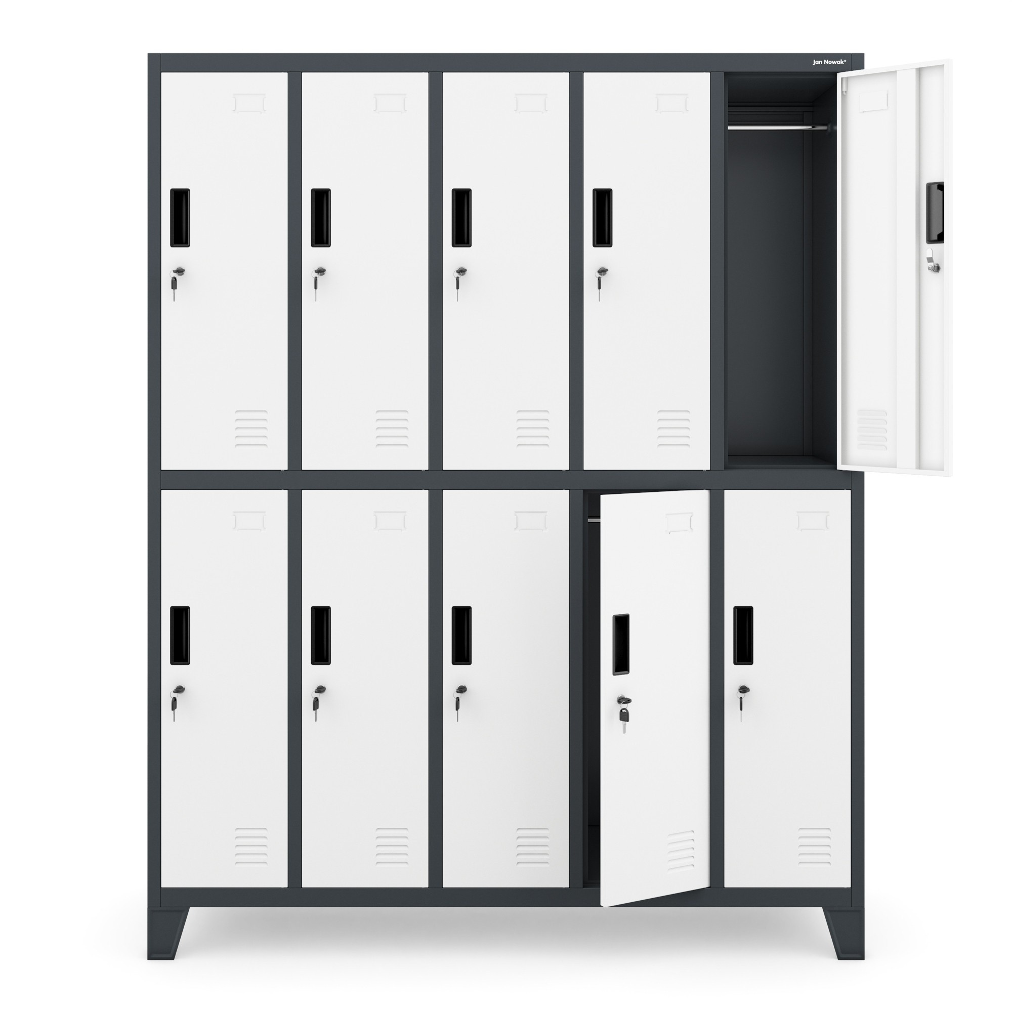 I přes své kompaktní rozměry nabízí skříň BARTEK překvapivě velký úložný prostor. Deset samostatných přihrádek poskytuje dostatek místa pro uložení oblečení, dokumentů, osobních věcí a dalších potřebných předmětů. Každá přihrádka je vybavena tyčí pro zavěšení ramínek, což usnadňuje organizaci a udržování pořádku.