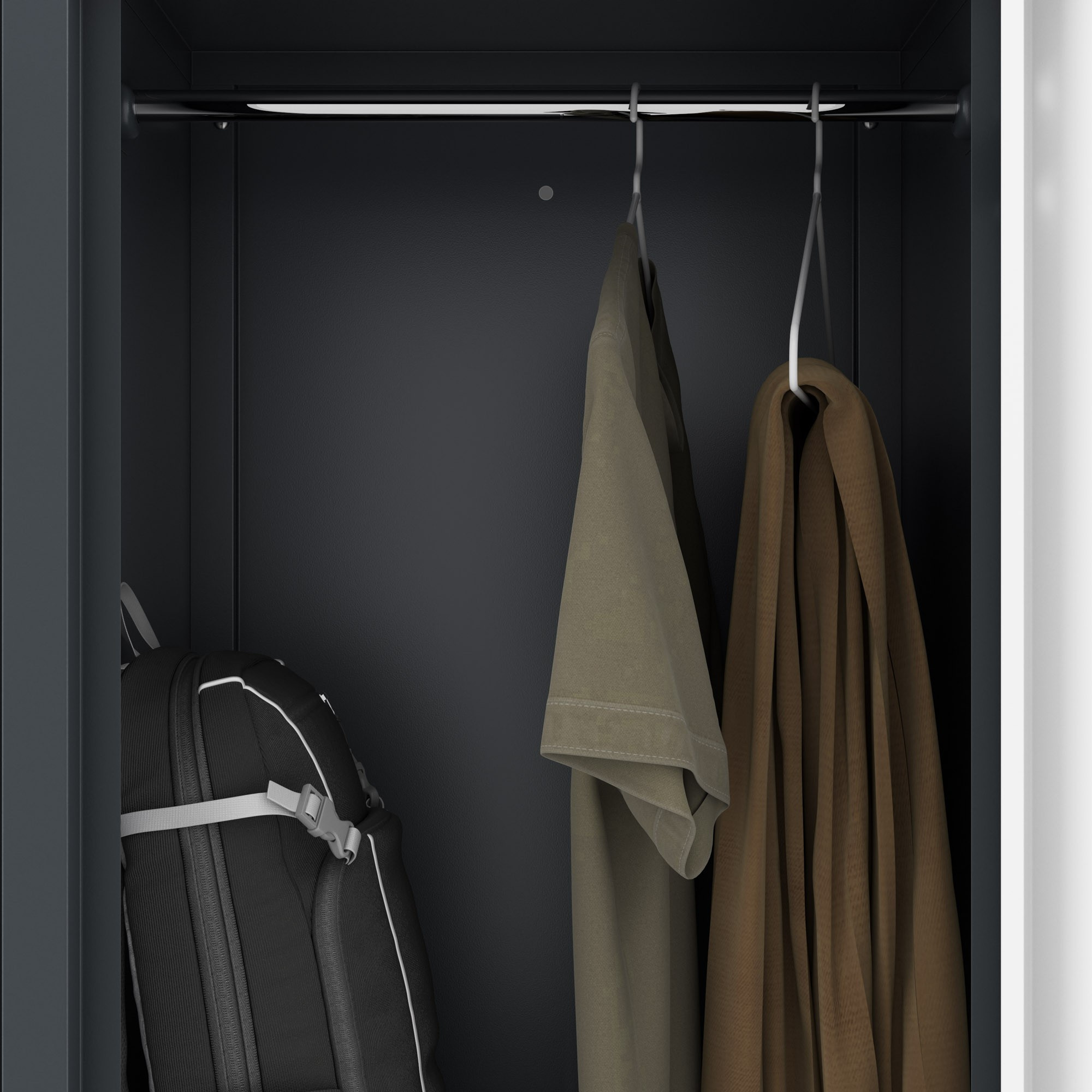 Skříň typu L nabízí až 4 samostatné uzamykatelné schránky, které poskytují dostatek prostoru pro uložení osobních věcí pro více uživatelů. Každá schránka je vybavena tyčí na zavěšení oděvů, což umožňuje pohodlné a bezpečné uložení i delších kusů oblečení. Prodloužené výklenky, s výškou až 114 cm v nejširším místě, zajišťují, že vaše oděvy zůstanou nezmačkané a v perfektním stavu.