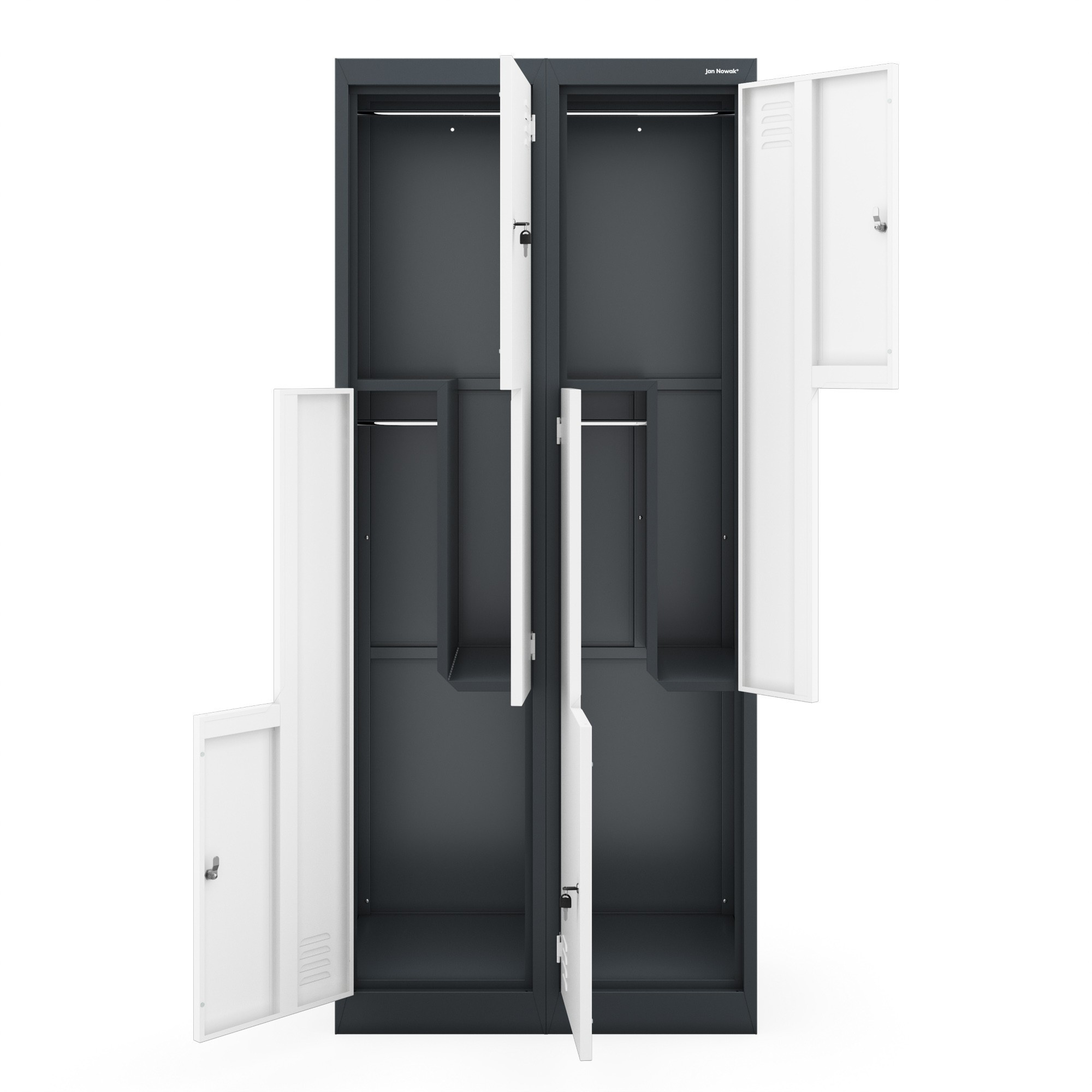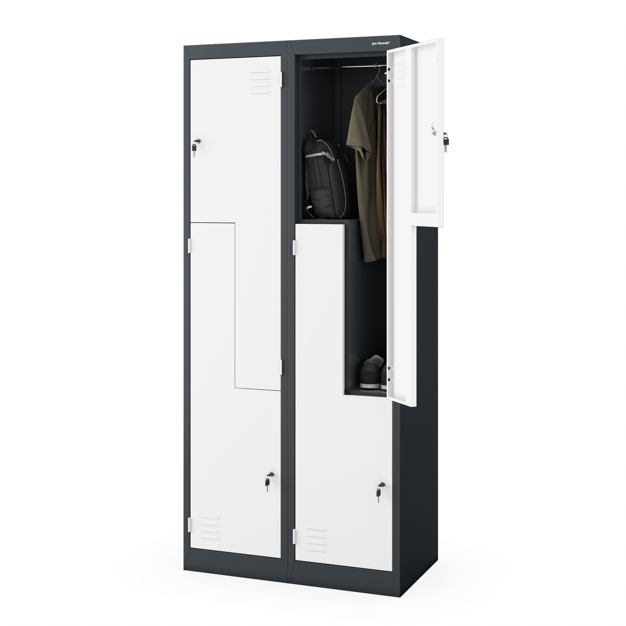 Hledáte ideální řešení pro ukládání oděvů a osobních věcí, které kombinuje robustnost, funkčnost a moderní design? Představujeme vám kovovou šatní skříň typu L JULIA v elegantní antracitově-bílé kombinaci, která se stane nepostradatelným prvkem ve vaší šatně, sportovním zařízení, škole nebo na pracovišti.