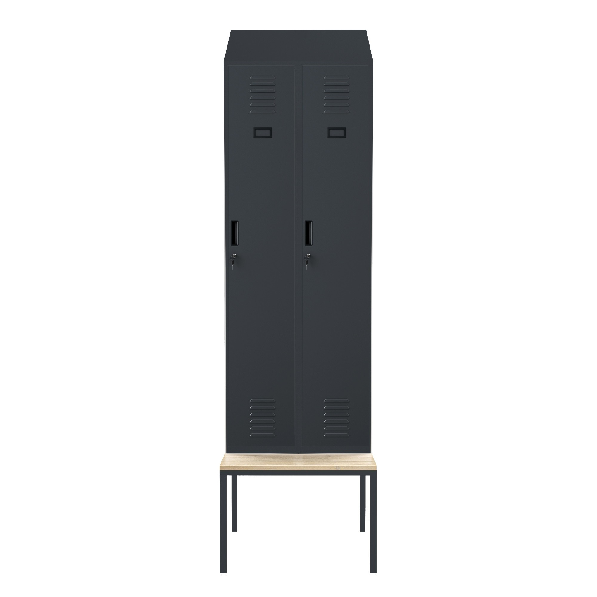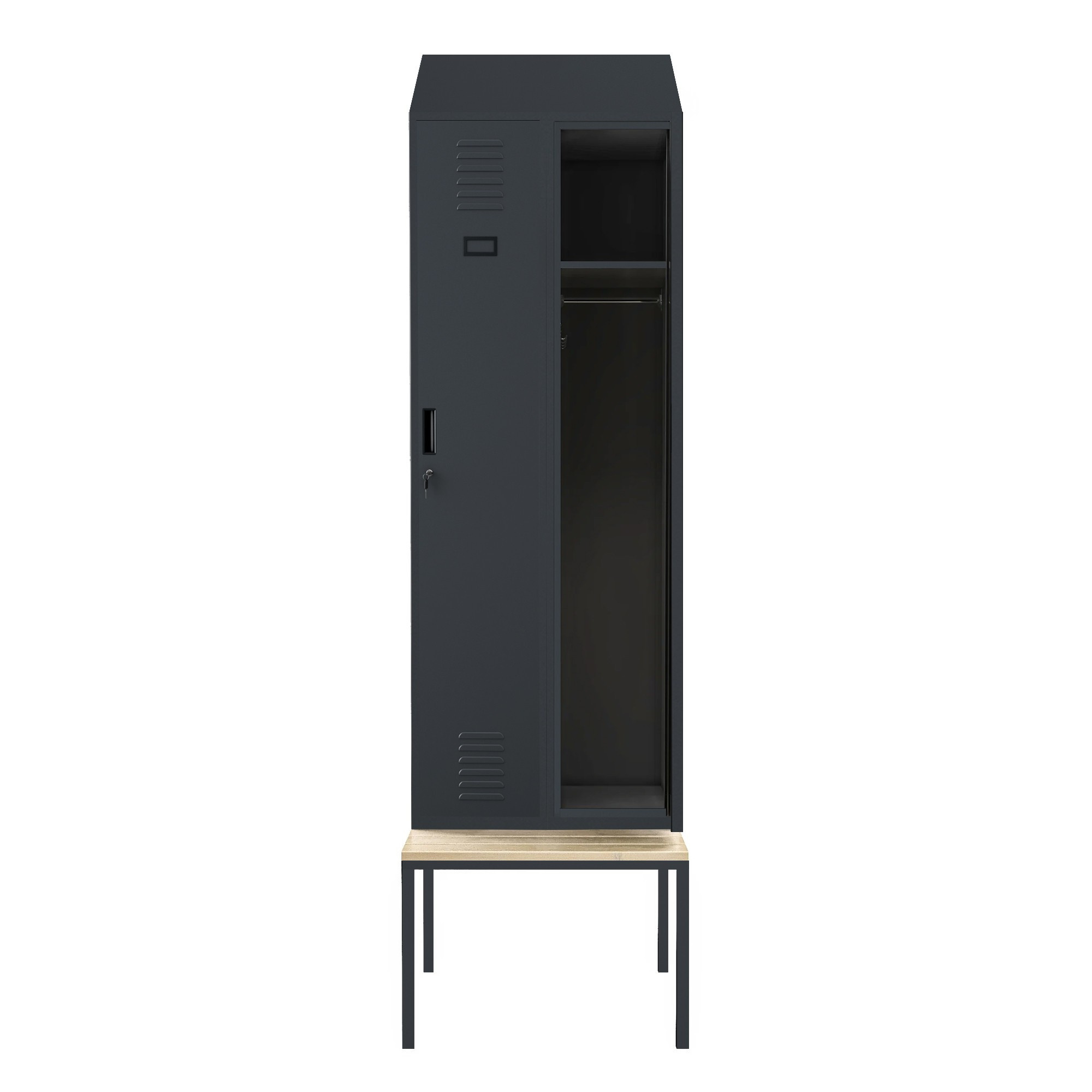 Obě přihrádky skříně jsou uzamykatelné na samostatný klíč, což zajišťuje maximální bezpečnost uložených věcí. Uživatelé se tak nemusí obávat ztráty nebo odcizení svých osobních předmětů. Uzamykatelný systém je ideální pro šatny s větším počtem uživatelů.