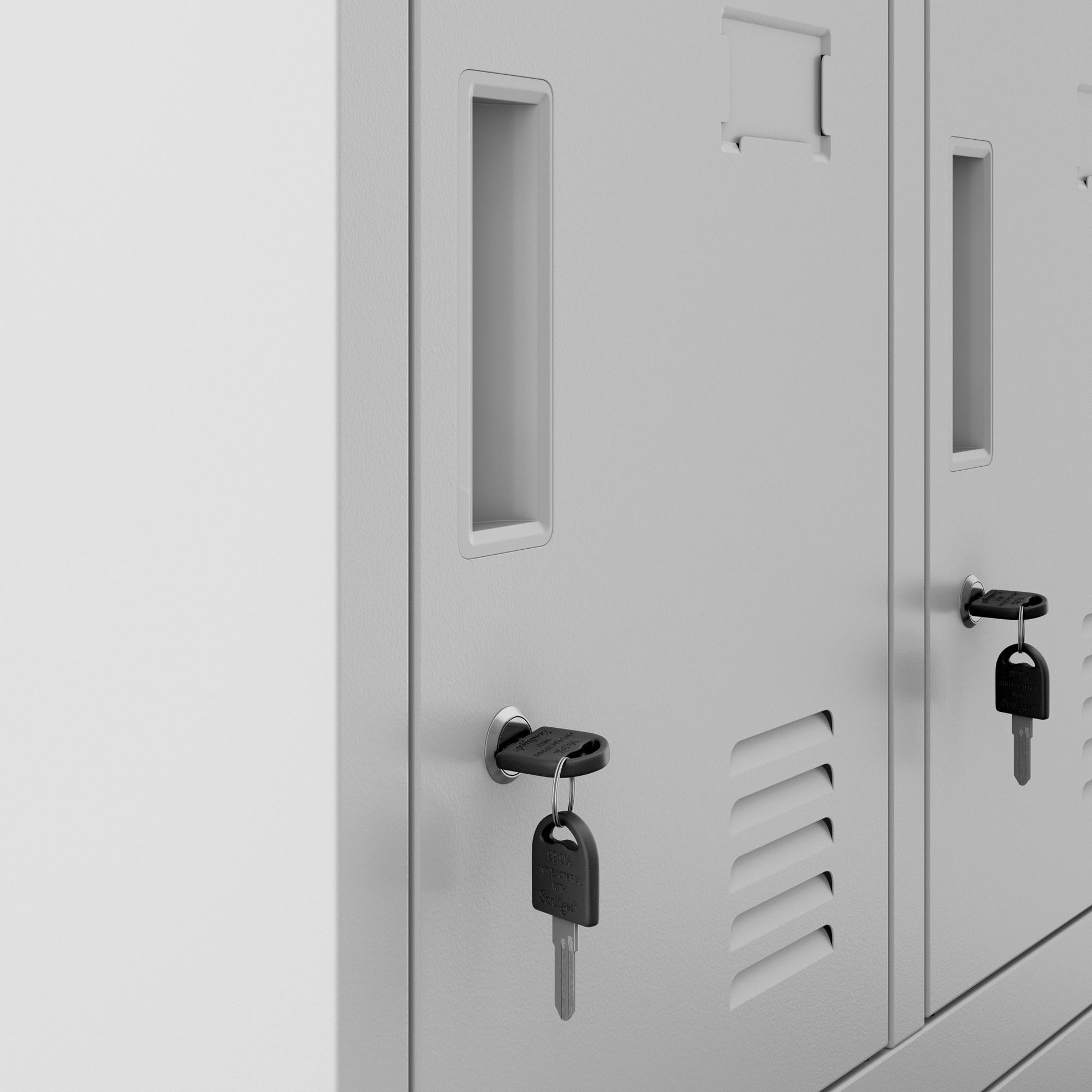 Větrací otvory ve dveřích skříněk zajišťují efektivní proudění vzduchu a redukci nepříjemných pachů a vlhkosti. Efektivní cirkulace vzduchu udržuje vaše věci svěží a hygienické. Každá skříňka je také vybavena vizitkářem na dveřích, který usnadňuje identifikaci jednotlivých přihrádek a eliminuje případné omyly.