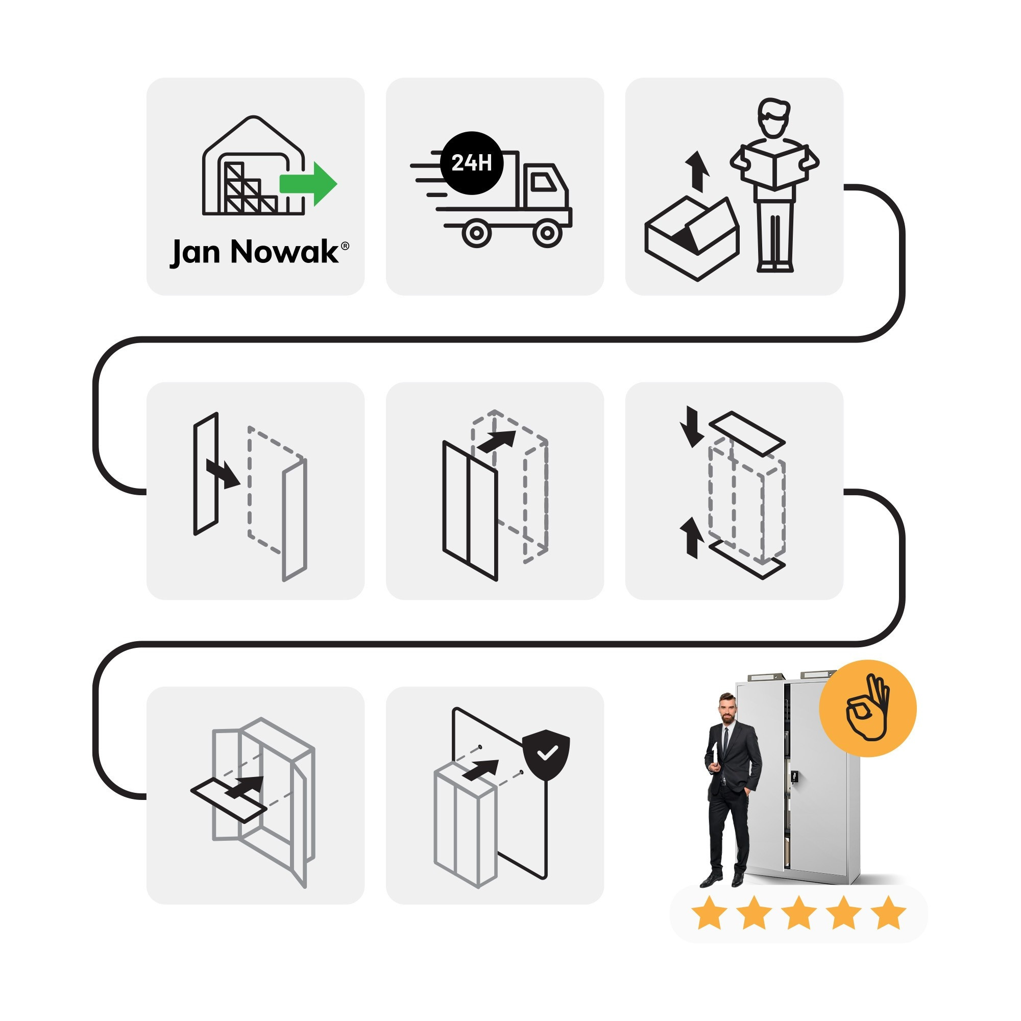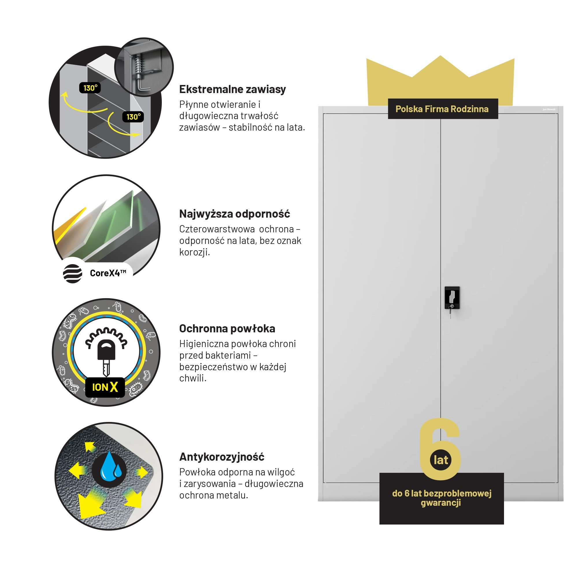 Skříň JAN II je vyrobena z kvalitní oceli o tloušťce 0,6 mm a ošetřena práškovým lakováním, které zajišťuje vysokou odolnost proti mechanickému poškození, korozi a opotřebení. Díky tomu vám bude skříň sloužit spolehlivě po mnoho let.