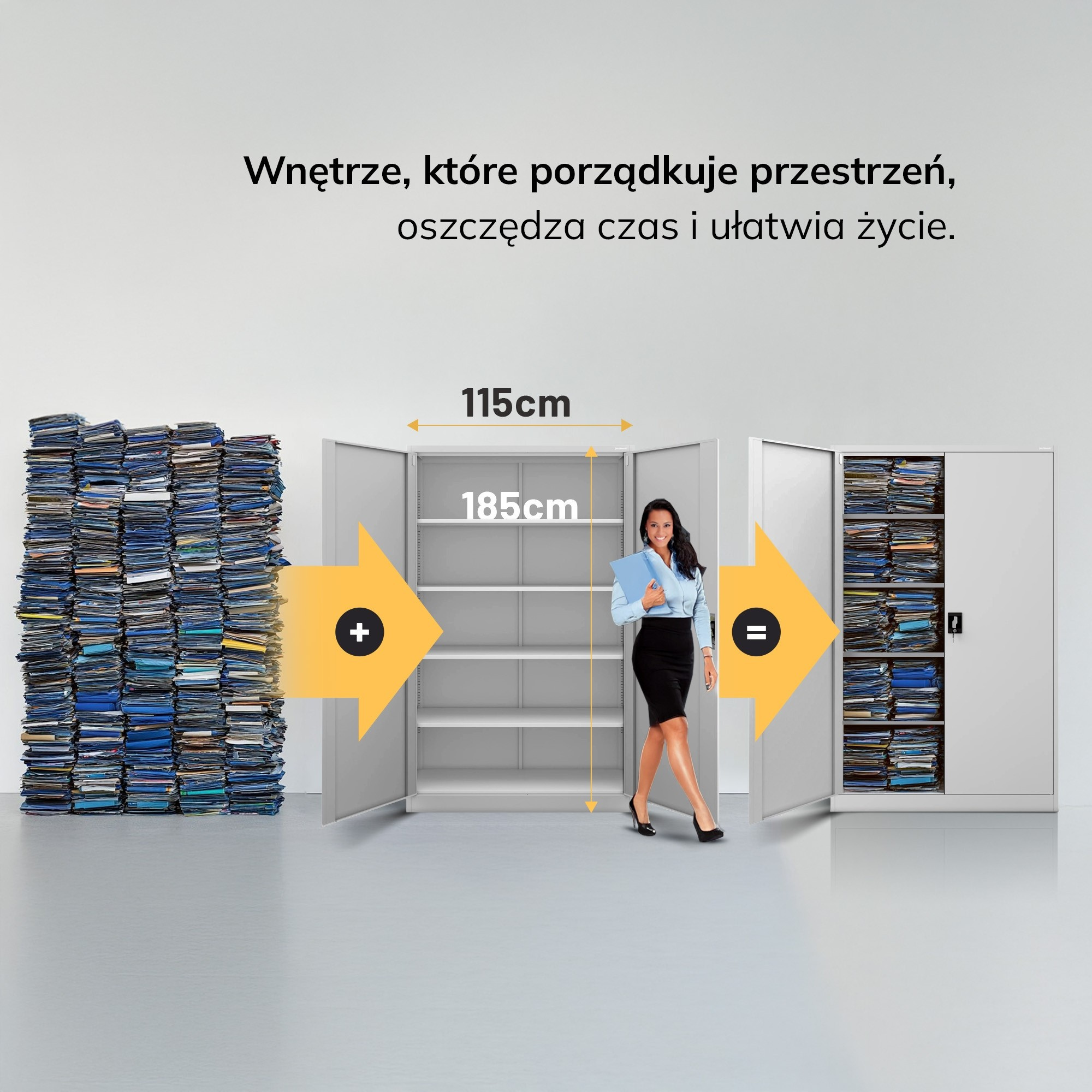 - Prostorný Interiér: Skříň pojme až 60 šanonů nebo jiné předměty, včetně těch větších rozměrů.