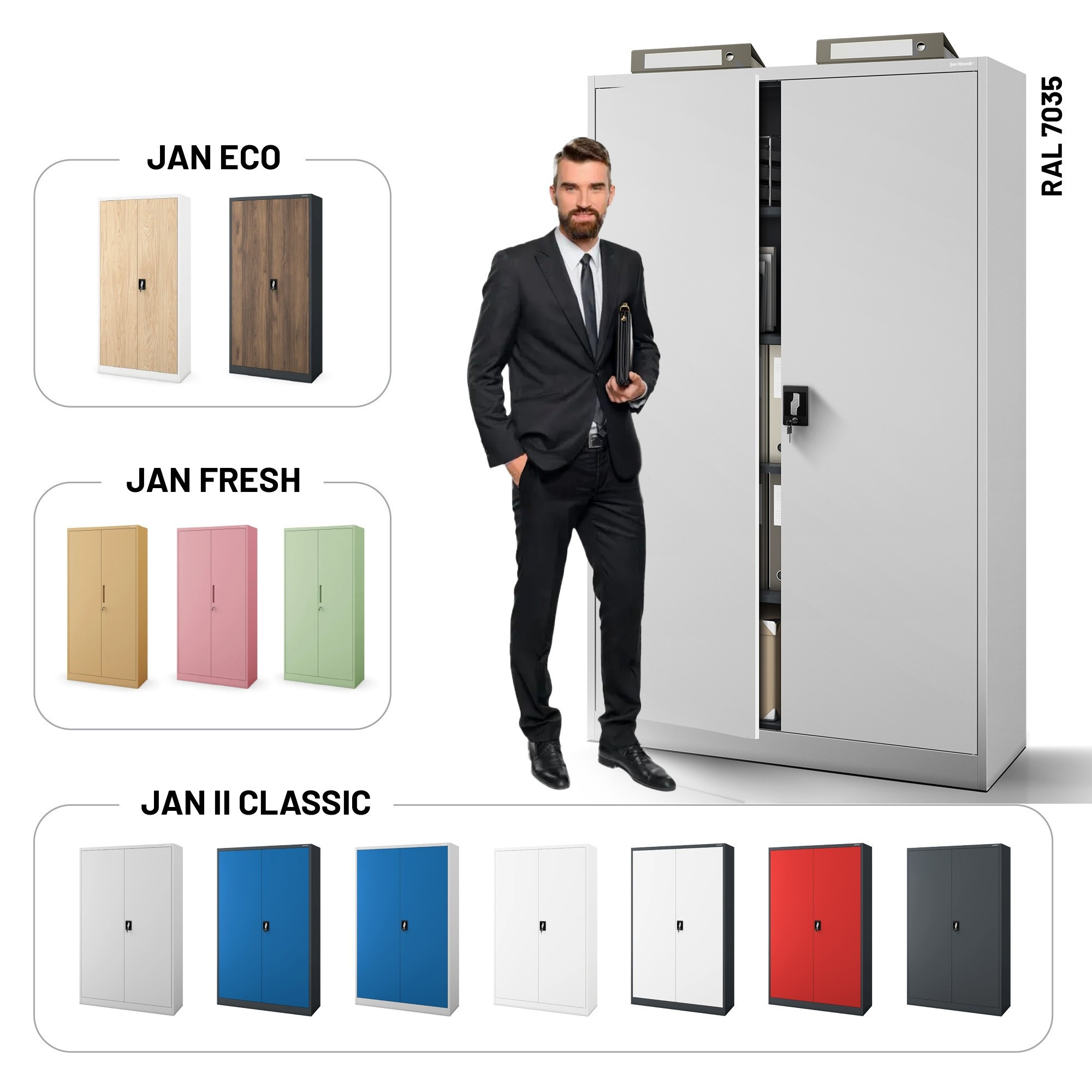 Díky svému minimalistickému designu a neutrální šedé barvě (RAL 7035) se skříň JAN II snadno začlení do jakéhokoliv interiéru. Skvěle se hodí do moderních kanceláří, industriálních loftů, skandinávsky zařízených prostor i minimalistických domácností. Její univerzální vzhled zaručuje, že se stane funkčním a estetickým doplňkem vašeho prostoru.