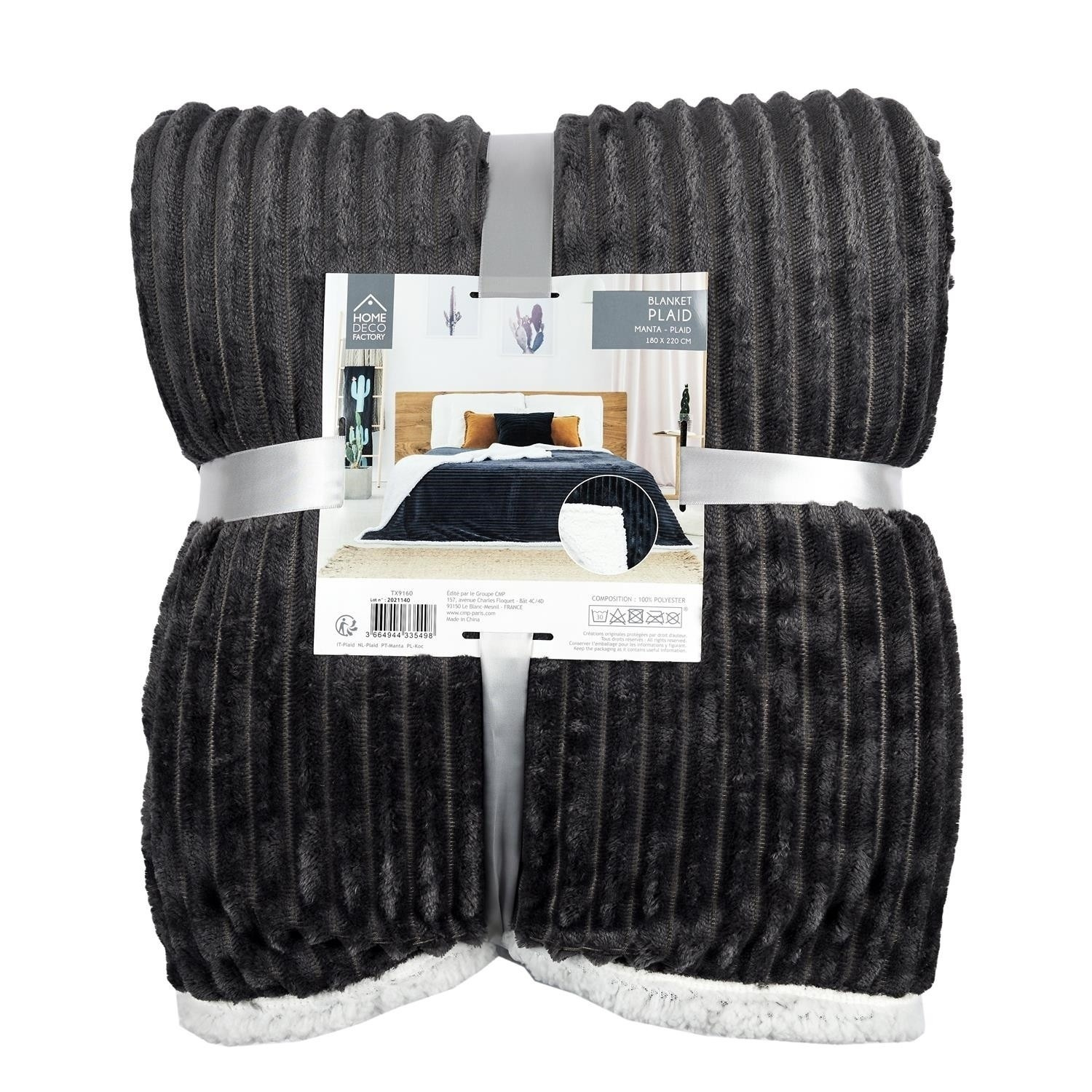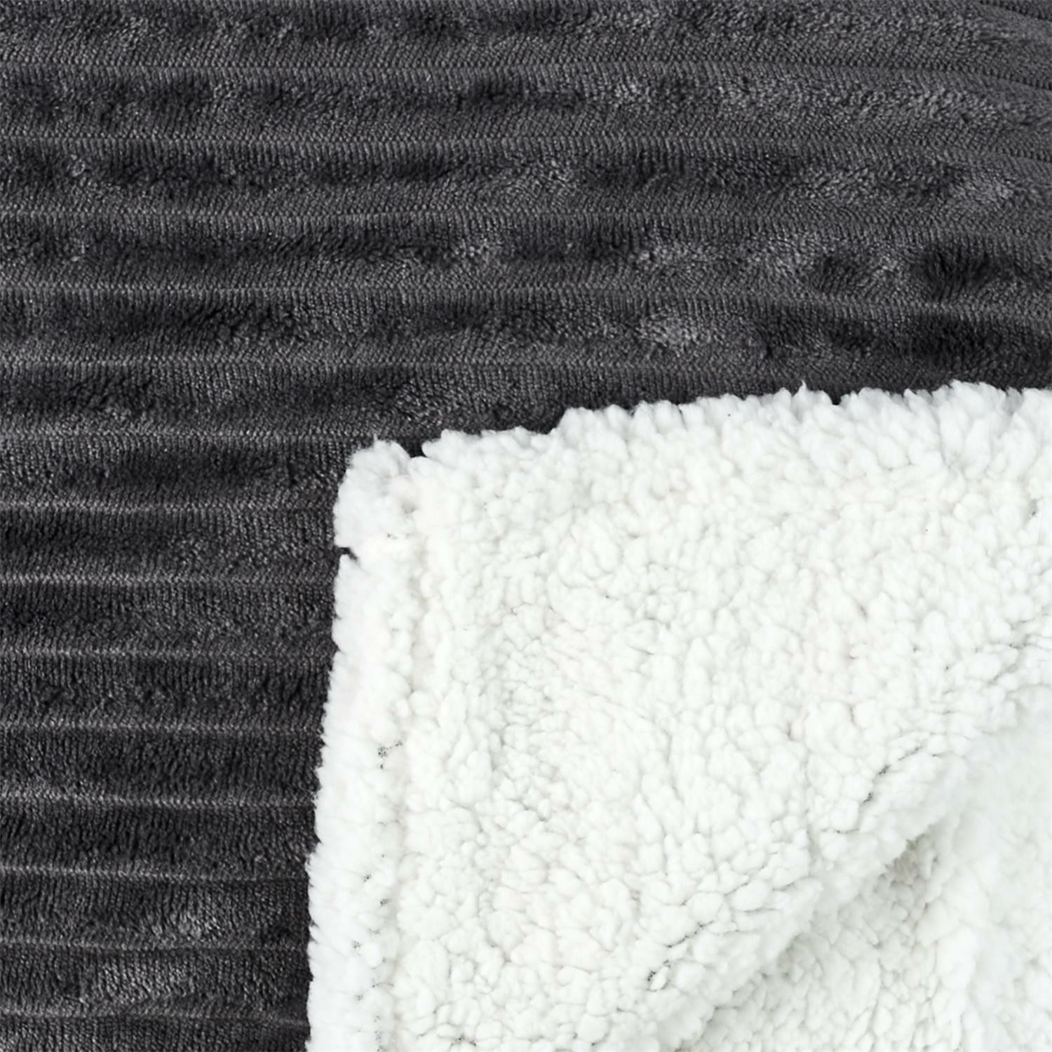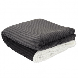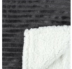 Velmi tlustá deka Sherpa z šedé žebrované tkaniny je z druhé strany obšitá bílou měkkou plyšovou tkaninou. Použití silných a teplých materiálů způsobuje, že deka je velmi silná až 6 cm, což poskytuje hodně tepla a měkkosti. Přehoz se osvědčí jako přikrývka během chladného večera, ale může také sloužit jako ochrana podlahy pro hrající si děti.
