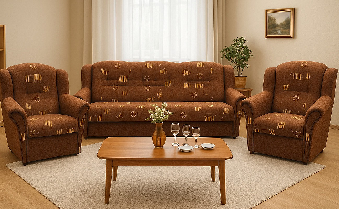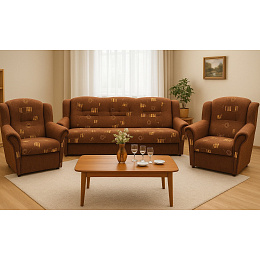 Agata je velmi oblíbeným klasickým modelem sedací soupravy v provedení 3F+1+1. Je velmi pohodlná a zároveň praktická. Sedací souprava je rozkládací a samozřejmostí je i úložný prostor. Jednoduchým rozkladem pomocí systému "klik klak" vznikne lůžko k příležitostnému přespání Vaší návštěvy. Sedací souprava je potažena kvalitní látkou a nabízíme ji v několika barvách. Výpň sedáků tvoří pružiny v kombinaci s kvalitní PUR pěnou. Tato kombinace zajistí velmi pohodlné sezení. Cena sedací soupravy je uvedena za rozkládací trojsed a dvě křesla.