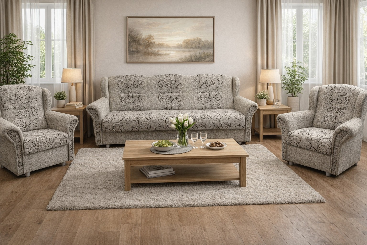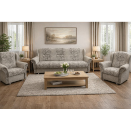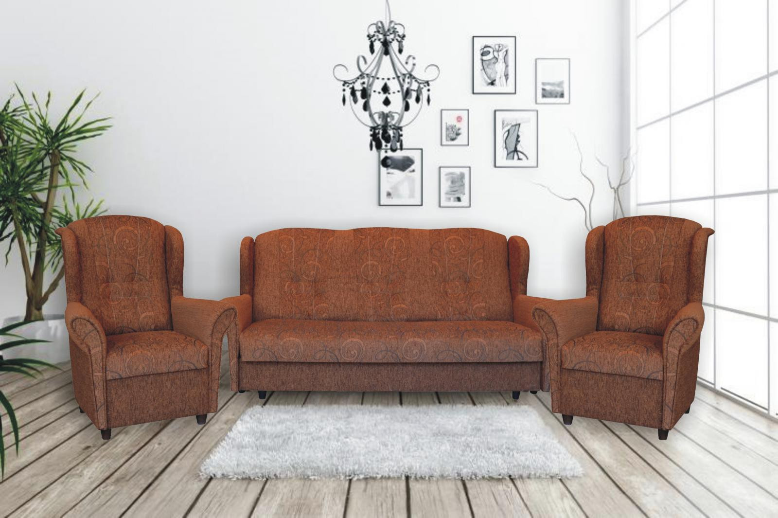 Sedací souprava Agáta MAX je stále velmi oblíbeným klasickým modelem sedací soupravy v provedení 3F+1+1. Je velmi pohodlná a zároveň praktická. Sedací souprava je rozkládací a samozřejmostí je i úložný prostor, který můžete využít např.na lůžkoviny. Jednoduchým rozkladem pomocí systému "klik klak" vznikne lůžko k příležitostnému přespání Vaší návštěvy. Sedací souprava je potažena kvalitní látkou, v kombinaci vzoru a jednobarevné látky. Výpň sedáků tvoří pružiny v kombinaci s kvalitní PUR pěnou. Tato kombinace ve spojení s extra vysokou opěrkou zad, je zárukou pohodlného sezení. Cena sedací soupravy je uvedena za rozkládací trojsed a dvě křesla. Vyobrazené doplňky a dekorace nejsou v ceně. Sedací souprava bude dodaná v potahové látce, která je vyobrazena na úvodní fotografii. V doplňkových fotografiích jsou vyobrazeny další možné varianty.