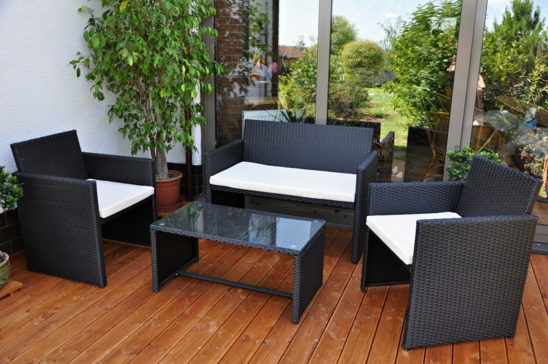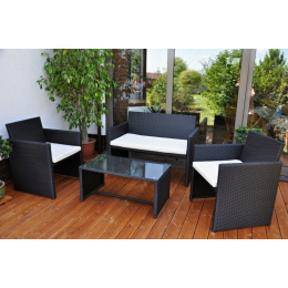 Sedací souprava s kovovou konstrukcí a výpletem z umělého ratanu. Sedací souprava je vhodná pro venkovní použití v zahradách, pergolách či altánech, ale také v iteriéru. Souprava se skládá z pohovky, 2 křesel, stolku se skleněnou deskou a kompletní sady polstrování s potahem z voděodolné látky. > | Materiál konstrukce je ocel, materiál výpletu je umělý ratan. Sedací souprava je vyplétána ručně. Velikost pohovky je 109x60x78 cm, nosnost pohovky je 200 kg Velikost křesla je 59x60x78 cm, nosnost křesla je 110 kg Výška sedu křesla je 42 cm. Velikost stolku se skleněnou deskou z temperovaného skla je 79x48x42 cm. Sklo stolku je temperované, takže se při rozbití rozpadne na malé kousíčky podobně jako sklo u automobilu, a nehrozí tak nebezpečí úrazu. Konce nohou stolku i křesel a pohovky jsou plastové, aby nedocházelo k poškození podlahy či terasy. Barva polstrů je bílá a látka je voděodolná. Polstry mají snímatelné povlaky.