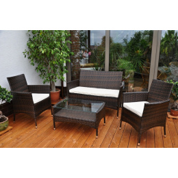 Sedací souprava s kovovou konstrukcí a výpletem z umělého ratanu. Sedací souprava je vhodná pro venkovní použití v zahradách, pergolách či altánech ale i v interiéru. Souprava se skládá z pohovky, 2 křesel, stolku se skleněnou deskou a kompletní sady polstrování | Materiál konstrukce je ocel, materiál výpletu je umělý ratan odolný proti UV záření. Sedací souprava je vyplétána ručně. Velikost pohovky je 114x62x84 cm, nosnost pohovky je 160 kg Velikost křesla je 59x62x84 cm, nosnost křesla je 110 kg Výška sedu je 42 cm. Velikost stolku se skleněnou deskou z temperovaného skla je 79x48x42 cm Barva polstrů je bílá káva, která má vyšší užitné vlastnosti, než polstry barvy bílé Barva výpletu je znázorněna na další fotografii.