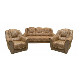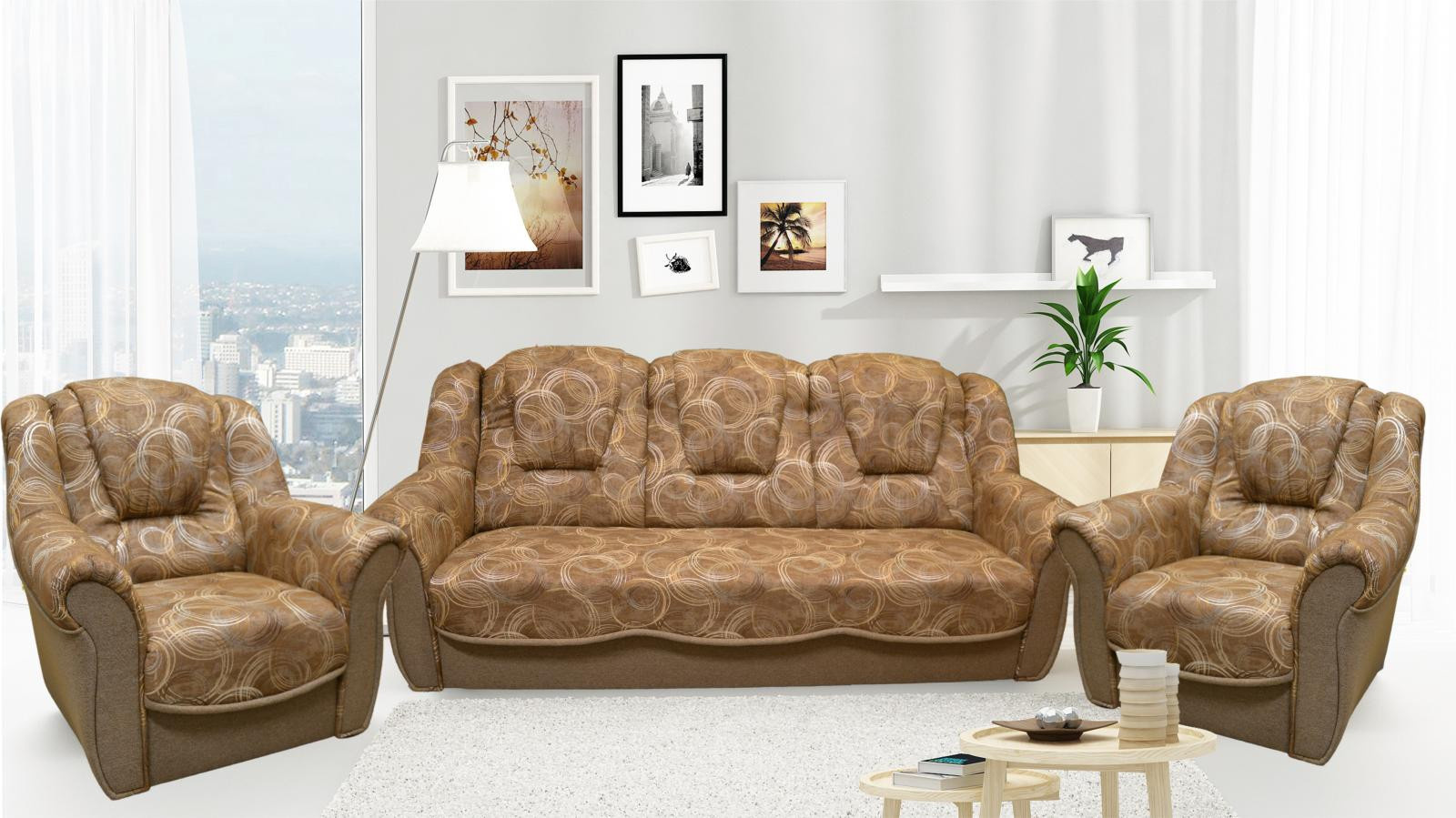 Sedací souprava Bára je stále velmi oblíbeným klasickým modelem sedací soupravy v provedení 3F+1+1. Je velmi pohodlná a zároveň praktická. Sedací souprava je rozkládací a samozřejmostí je i úložný prostor, který můžete využít např.na lůžkoviny. Jednoduchým rozkladem pomocí systému "klik klak" vznikne lůžko k příležitostnému přespání Vaší návštěvy. Sedací souprava je potažena kvalitní látkou, v kombinaci vzoru a jednobarevné látky. Cena sedací soupravy je uvedena za rozkládací trojsed a dvě křesla.