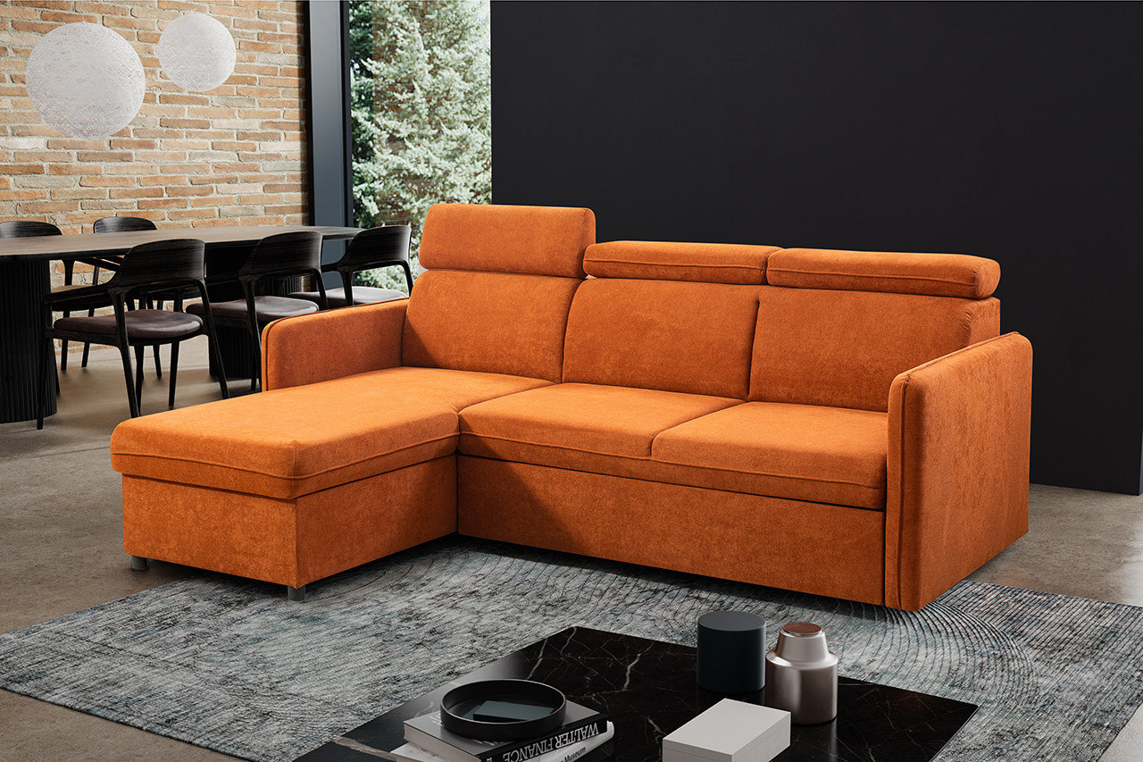 Sedací souprava Barica je vyrobena v jednoduché elegantní linii, které se hodí do moderního i klasického interiéru. Její velkou předností je univerzální použití. Tzn. že si ji můžete podle potřeby sestavit jako levou nebo pravou, což je výhoda při zařizování obývacího pokoje. Nemusíte přemýšlet do jakého rohu sedací soupravu postavíte. Jednoduše si ji podle potřeby přizpůsobíte. Sedací souprava je rozkládací. Jednoduchým rozložením pomocí automatu, vytvoříte dostatečně velké lůžko k příležitostnému přespání Vaší návštěvy. Samozřejmostí je i praktický úložný prostor, který můžete využít např. na lůžkoviny. Sedací souprava je potažena kvalitní látkou a nabízíme ji na objednávku v několika odstínech. Výplň sedáků tvoří kombinace pružin s kvalitní PUR pěnou, což zajišťuje velmi pohodlné sezení. Pro pohodlí při sezení a odpočinku je sedací souprava vybavena polohovacími opěrkami hlavy. Správná barva potahové látky je zobrazena na druhé fotografii. Ostatní fotografie jsou pouze ilustrační.