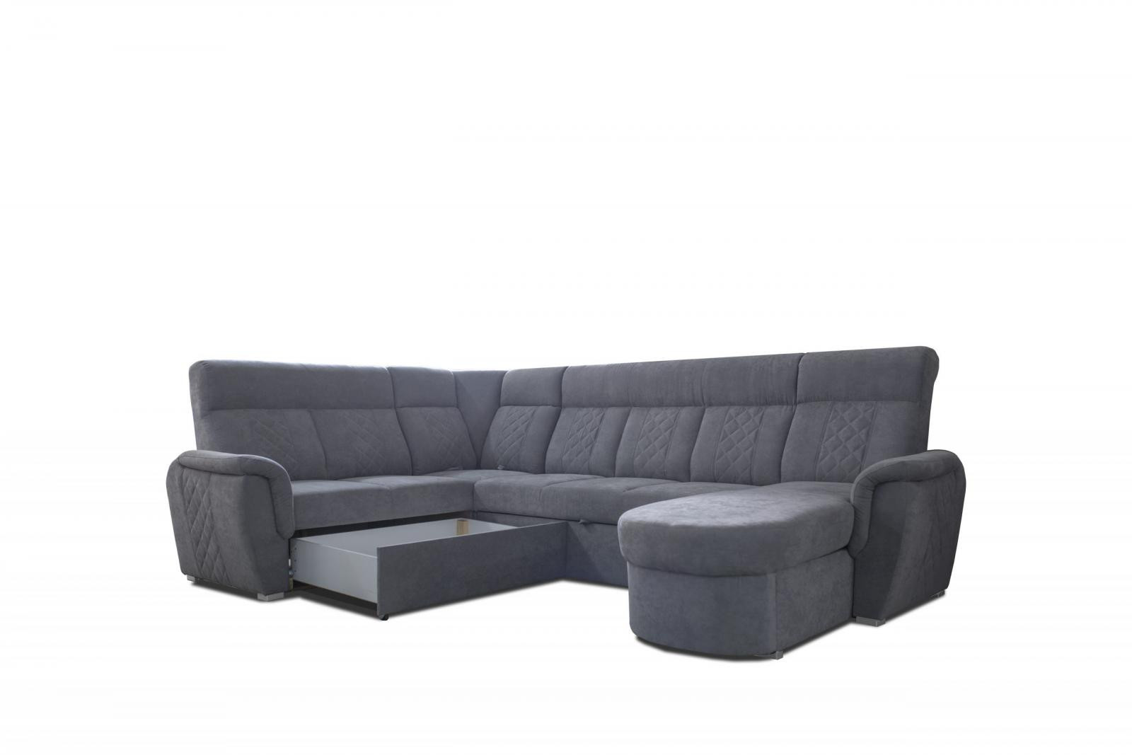 Pohodlná prostorná sedací souprava je vyrobená z kombinace pružin a kvalitní PUR pěny. Očalouněna je velmi příjemnou čalounickou látkou. Sedačka je rozkládací a jednoduchým rozkladem vznikne prostorné lůžko pro občasné přespání. Velký úložný prostor je součástí. Sedačka má dvě polohovatelné zádové opěrky, díky kterým bude ležení např u TV ještě pohodlnější. Sedací souprava má dostatečně vysoká záda a je velmi komfortní na posed. Sedačka bude dodána jako na úvodním obrázku v levé verzi (ostatní obrázky jsou pouze ilustrační). Tuto sedací souprava nabízíme také v opačné variantě. Zboží je dodáváno v demontu na paletě.