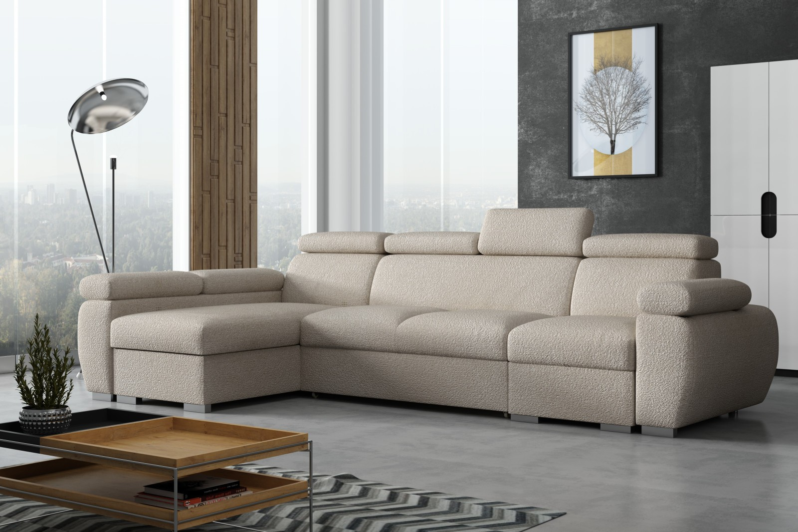 Sedací souprava Bodie se stane příjemným centrem odpočinku, nebo setkání s rodinou a přáteli. Je velmi pohodlná, praktická a nabízí dostatek místa k sezení. Praktickou stránkou sedací soupravy je možnost rozložení k příležitostnému přespání a také nepostradatelný úložný prostor. Pohodlí při sezení zajišťuje výplň sedáků, kterou tvoří kombinace vlnitých pružin s kvalitní PUR pěnou. Při odpočinku, nebo sledování televize Vám zvýší pohodlí polohovací opěrky. Sedací souprava je potažena kvalitní látkou Anthology, která je originální a extrémně měkká, se specifickou bouclé texturou. Látka se snadno čistí a udržuje v perfektním stavu. Sedací soupravu nabízíme v levém i pravém provedení. Vyobrazené doplňky a dekorace nejsou v ceně. Fotografie sedací soupravy v rozkladu jsou pouze ilustrační. Správný barevný odstín je zobrazen na úvodní fotografii.