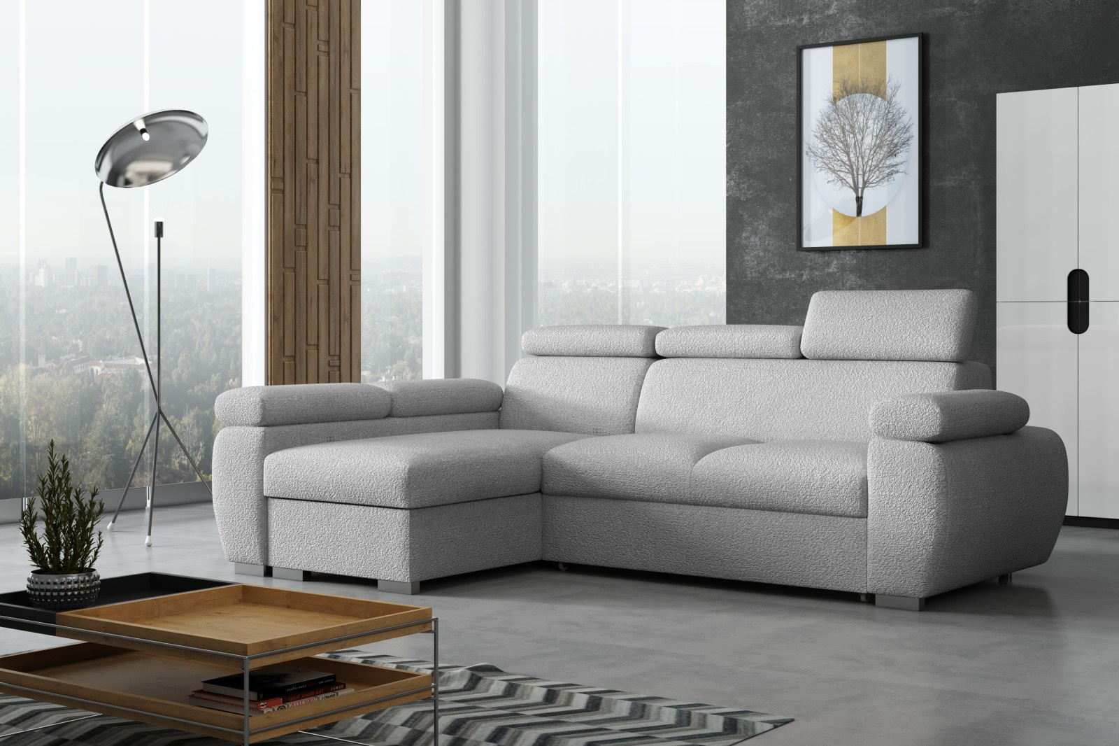 Sedací souprava Bodie se stane příjemným centrem odpočinku, nebo setkání s rodinou a přáteli. Je velmi pohodlná, praktická a nabízí dostatek místa k sezení. Praktickou stránkou sedací soupravy je možnost rozložení k příležitostnému přespání a také nepostradatelný úložný prostor. Pohodlí při sezení zajišťuje výplň sedáků, kterou tvoří kombinace vlnitých pružin s kvalitní PUR pěnou. Při odpočinku, nebo sledování televize Vám zvýší pohodlí polohovací opěrky. Sedací souprava je potažena kvalitní látkou Anthology, která je originální a extrémně měkká, se specifickou bouclé texturou. Látka se snadno čistí a udržuje v perfektním stavu. Sedací soupravu nabízíme v levém i pravém provedení. Vyobrazené doplňky a dekorace nejsou v ceně. Fotografie sedací soupravy v rozkladu jsou pouze ilustrační. Správný barevný odstín je zobrazen na úvodní fotografii.
