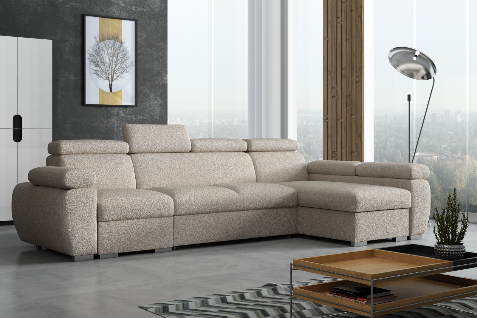 Sedací souprava Bodie se stane příjemným centrem odpočinku, nebo setkání s rodinou a přáteli. Je velmi pohodlná, praktická a nabízí dostatek místa k sezení. Praktickou stránkou sedací soupravy je možnost rozložení k příležitostnému přespání a také nepostradatelný úložný prostor. Pohodlí při sezení zajišťuje výplň sedáků, kterou tvoří kombinace vlnitých pružin s kvalitní PUR pěnou. Při odpočinku, nebo sledování televize Vám zvýší pohodlí polohovací opěrky. Sedací souprava je potažena kvalitní látkou Anthology, která je originální a extrémně měkká, se specifickou bouclé texturou. Látka se snadno čistí a udržuje v perfektním stavu. Sedací soupravu nabízíme v levém i pravém provedení. Vyobrazené doplňky a dekorace nejsou v ceně. Fotografie sedací soupravy v rozkladu jsou pouze ilustrační. Správný barevný odstín je zobrazen na úvodní fotografii.