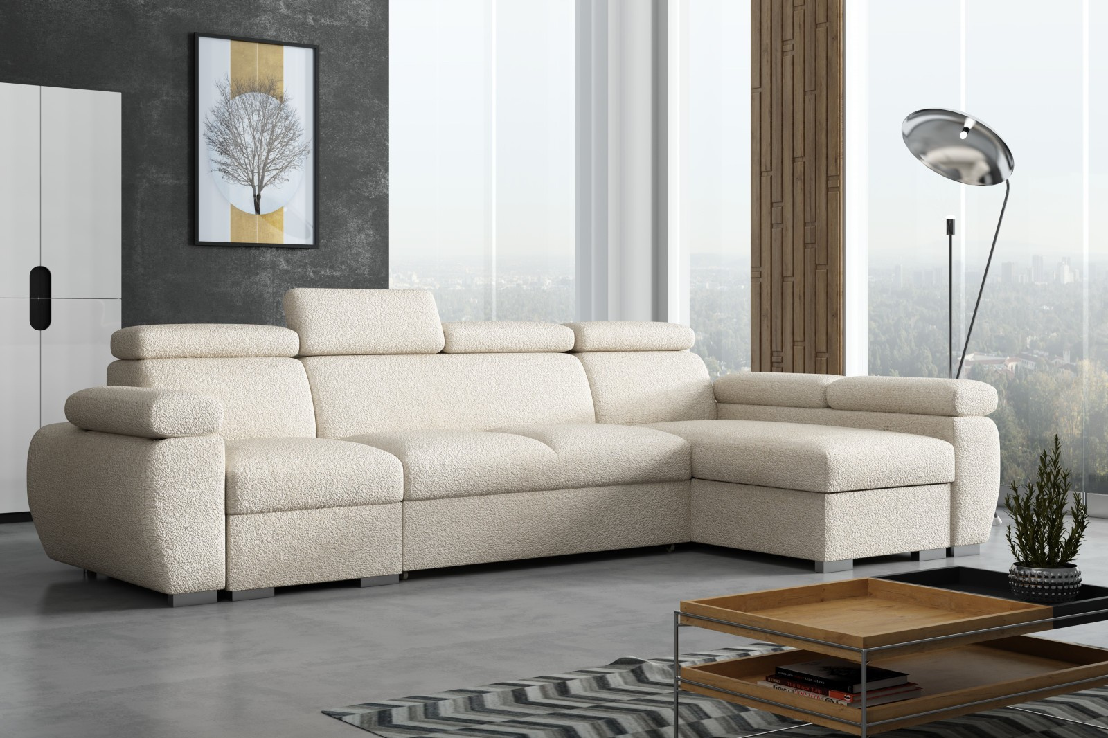 Sedací souprava Bodie se stane příjemným centrem odpočinku, nebo setkání s rodinou a přáteli. Je velmi pohodlná, praktická a nabízí dostatek místa k sezení. Praktickou stránkou sedací soupravy je možnost rozložení k příležitostnému přespání a také nepostradatelný úložný prostor. Pohodlí při sezení zajišťuje výplň sedáků, kterou tvoří kombinace vlnitých pružin s kvalitní PUR pěnou. Při odpočinku, nebo sledování televize Vám zvýší pohodlí polohovací opěrky. Sedací souprava je potažena kvalitní látkou Anthology, která je originální a extrémně měkká, se specifickou bouclé texturou. Látka se snadno čistí a udržuje v perfektním stavu. Sedací soupravu nabízíme v levém i pravém provedení. Vyobrazené doplňky a dekorace nejsou v ceně. Fotografie sedací soupravy v rozkladu jsou pouze ilustrační. Správný barevný odstín je zobrazen na úvodní fotografii.