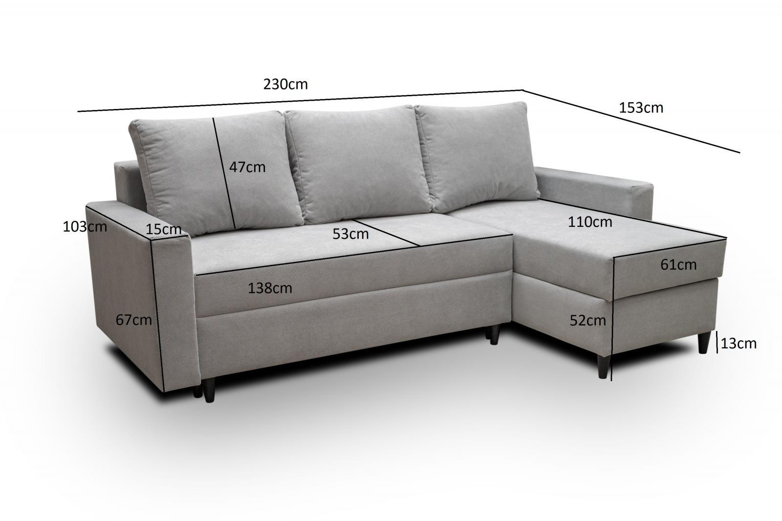 Carine je moderní rohová sedací souprava s nadčasovým designem. Její předností je pohodlí, praktičnost a univerzální použití. Můžete si ji podle potřeby sestavit jako levou nebo pravou, což je výhoda při zařizování obývacího pokoje. Nemusíte přemýšlet do jakého rohu postavíte sedací soupravu, jednoduše ji podle potřeby přizpůsobíte. Pohodlí při sezení zajišťuje kombinace pružin bonell s kvalitní PUR pěnou a velké opěrné polštáře, které jsou odnímatelné, takže si je můžete přizpůsobit svým potřebám. Praktickou stránkou sedací soupravy je úložný prostor a možnost rozložení k občasnému přespání Vaší návštěvy. Sedací souprava je potažena kvalitní látkou Mellow a nabízíme ji v několika odstínech. Správná barva sedací soupravy je vyobrazena v úvodních fotografiích. Ostatní fotografie jsou ilustrační.
