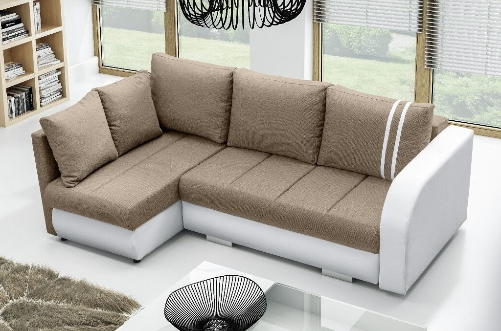 Rohová sedací souprava Citizen, je vzhledem ke svým rozměrům, vhodná do menších pokojů. Sedací souprava je rozkládací a má také 2 praktické úložné prostory. Jednoduchým rozložením vznikne dostatečně velké lůžko vhodné k příležitostnému spaní. Výplň sedáku tvoří kombinace pružin faliste s kvalitní PUR pěnou. Tato kombinace zajistí pohodlné sezení. Sedací souprava je potažena kvalitní látkou v kombinaci s bílou EKO kůží. Tuto sedačku nabízíme v několika barevných variantách. V ceně sedací soupravy je 5 opěrných polštářů. Ostatní vyobrazené dekorace nejsou v ceně.