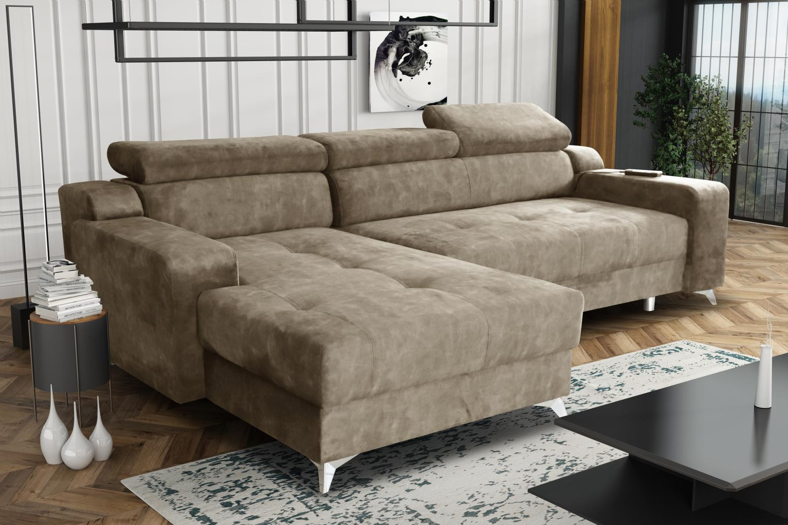 Sedací souprava Darina osloví každého, kdo preferuje moderní vzhled a zároveň pohodlí a praktičnost. Je potažena kvalitní potahovou látkou s elegantním prošitím na sedací části. Naprostou novinkou u této sedací soupravy je elektrický rozklad. Po stisknutí ovládacího tlačítka se vysune sedací část do polohy pro spaní. Má také velmi praktický úložný prostor, který můžete využít např., na lůžkoviny. Pohodlí při sezení zajišťuje výplň sedáků, kterou tvoří kombinace pružin faliste s kvalitní PUR pěnou. Komfort a pohodlí při odpočinku zvyšuje polohovací opěrka hlavy. Sedací soupravu nabízíme v levém i pravém provedení. Vyobrazené dekorace a doplňky nejsou v ceně sedací soupravy. Zobrazení barev na fotografii se může od skutečnosti lišit. Fotografie sedací soupravy v rozkladu jsou pouze ilustrační, správný odstín je zobrazen na úvodní fotografii.