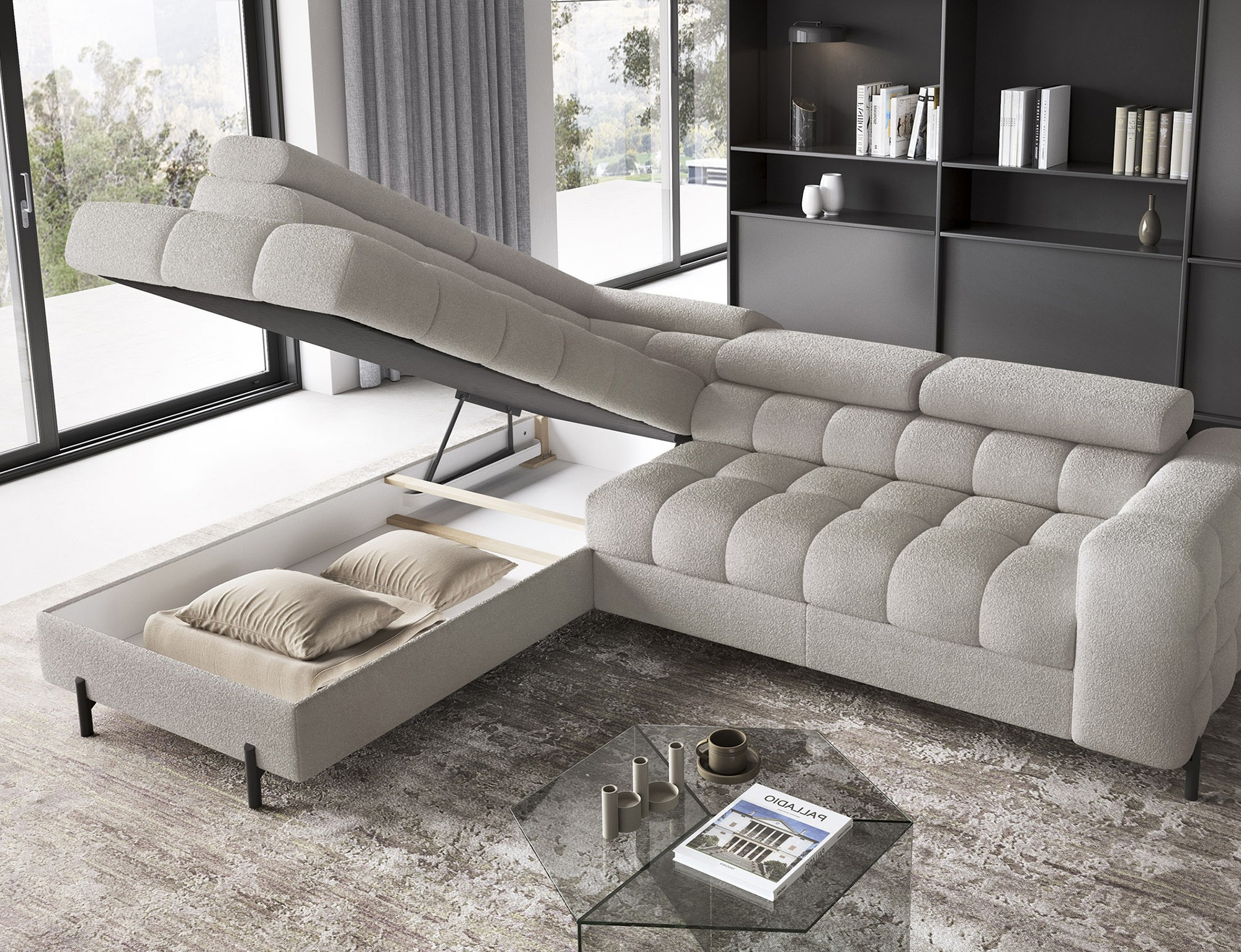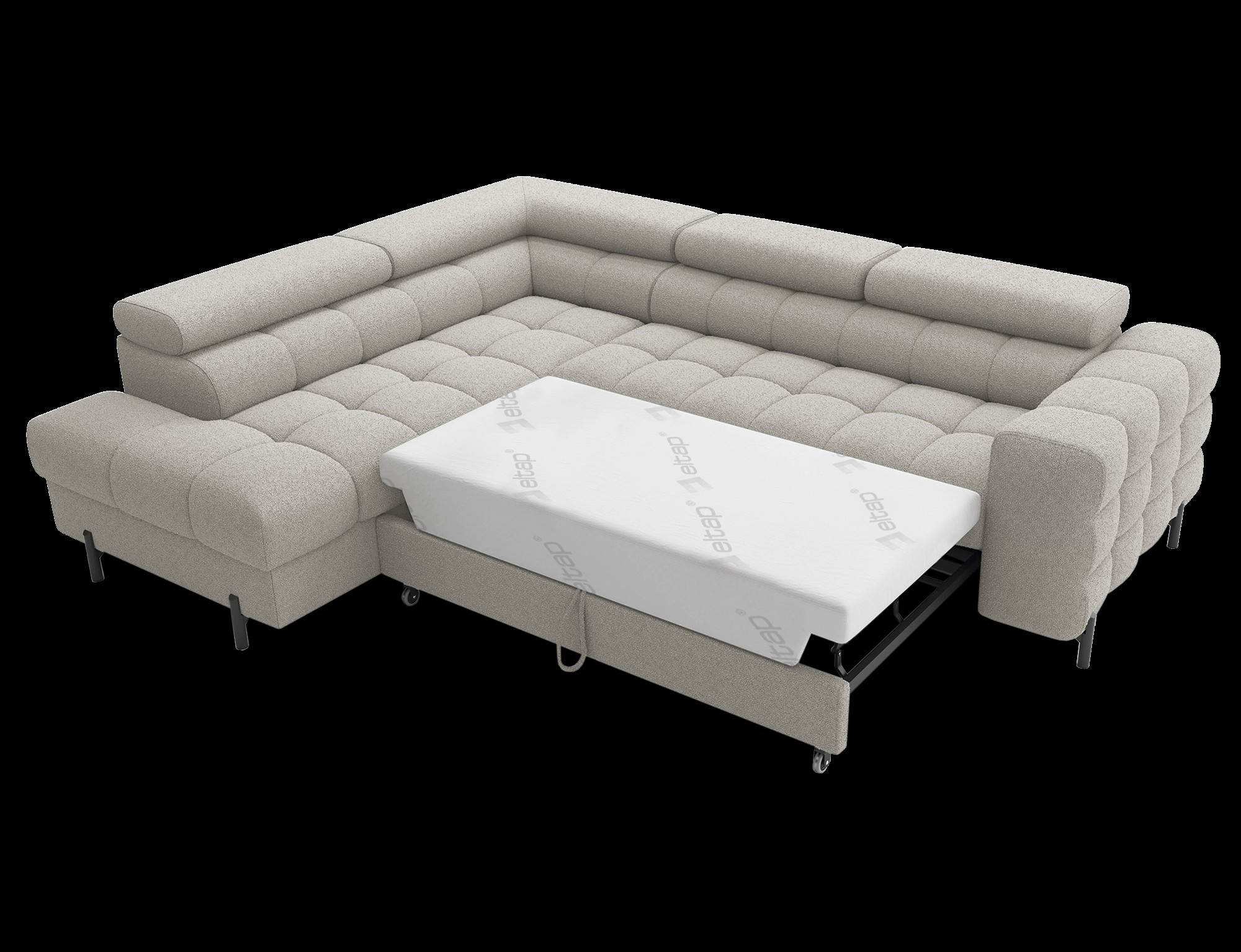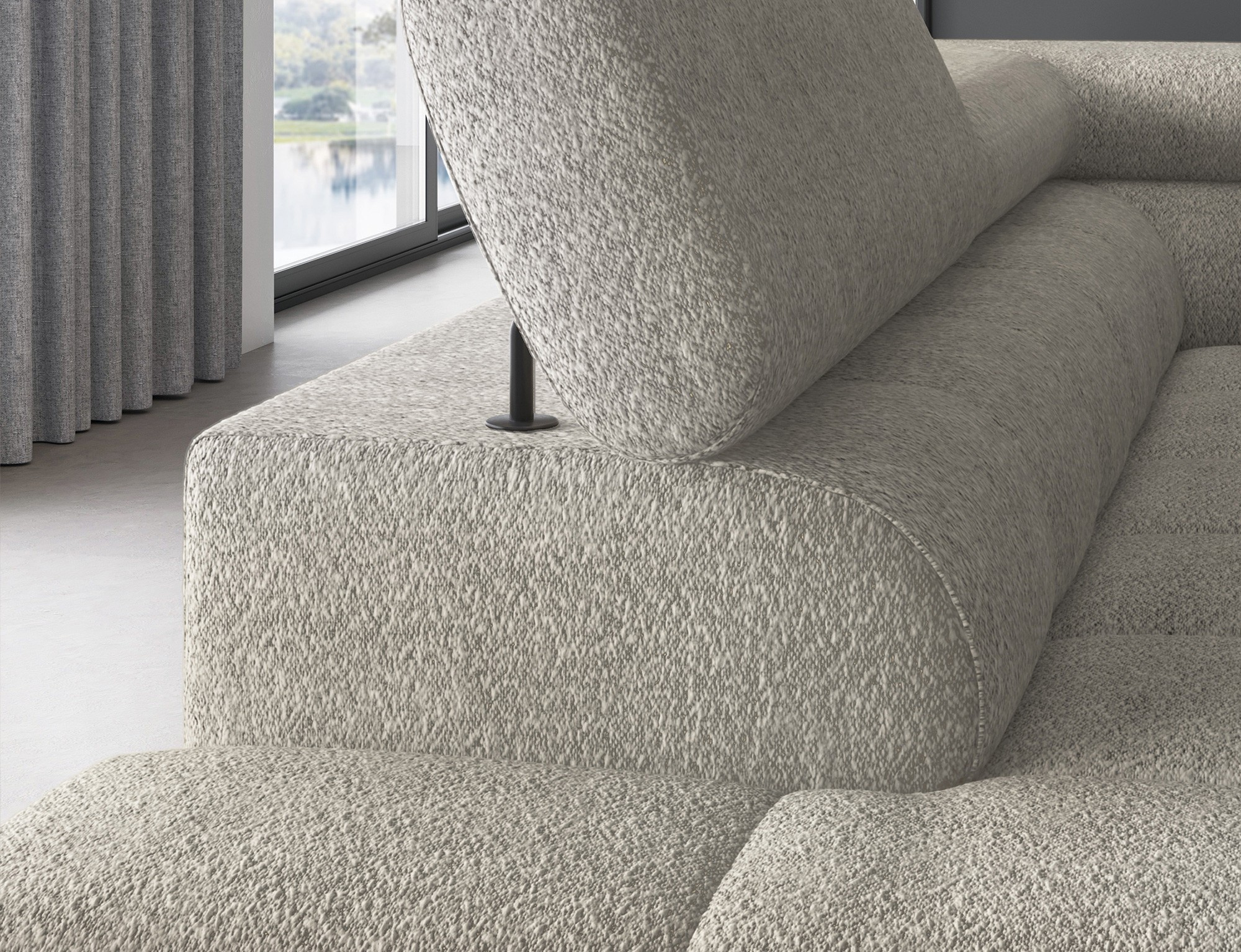 L-tvarovaná Ferucce s rozměry 276x200x72-93 cm je stylový a funkční kus nábytku, ideální pro moderní interiéry. Jeho nastavitelné opěrky hlavy umožňují přizpůsobení výšky opěradla, což zajišťuje maximální pohodlí během relaxace. Pohovka kombinuje eleganci s praktičností, nabízí dostatek prostoru pro relaxaci a pohodlné místo pro celou rodinu. Jeho promyšlený design z něj činí nejen pohodlný, ale také esteticky příjemný v obývacím pokoji.