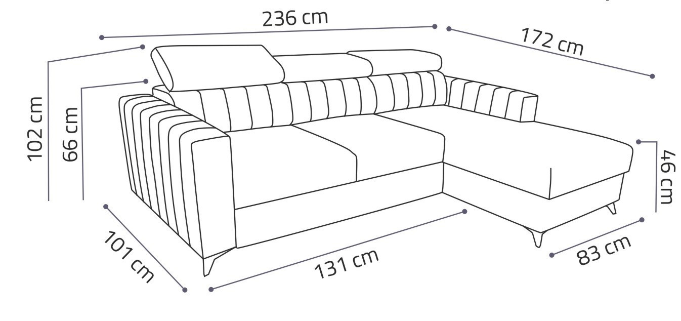 Sedací souprava Mildred Premium osloví každého, kdo preferuje moderní vzhled a zároveň pohodlí a praktičnost. Sedací souprava je velmi pohodlná a dostatečně velká na posezení s přáteli, nebo rodinou. Pro případ, že se návštěva zdrží přes noc, je sedací souprava vybavena rozkladem, díky kterému sedací soupravu jednoduše přeměníte v prostorné lůžko. Sedací souprava má praktický úložný prostor, který můžete využít např., na lůžkoviny. Pohodlí při sezení zajišťuje výplň sedáků, kterou tvoří kombinace pružin faliste s kvalitní PUR pěnou. Komfort a pohodlí při odpočinku zvyšuje polohovací opěrka hlavy. Sedací soupravu nabízíme v levém i pravém provedení. Správná barva potahové látky je zobrazena na první fotografii. Ostatní fotografie jsou pouze ilustrační.