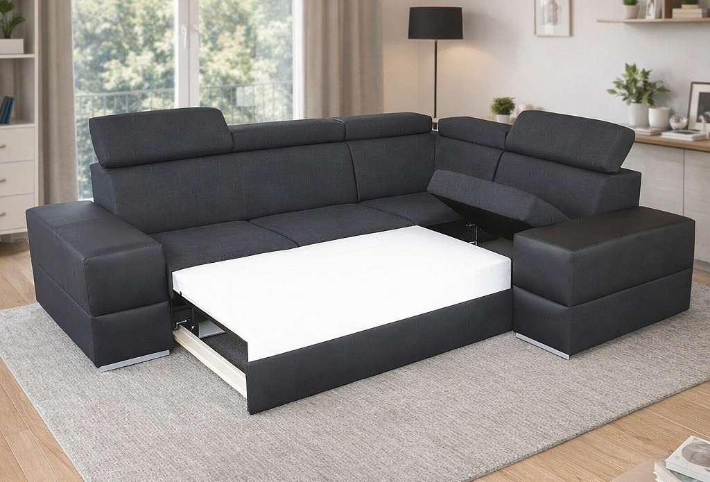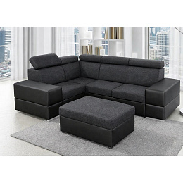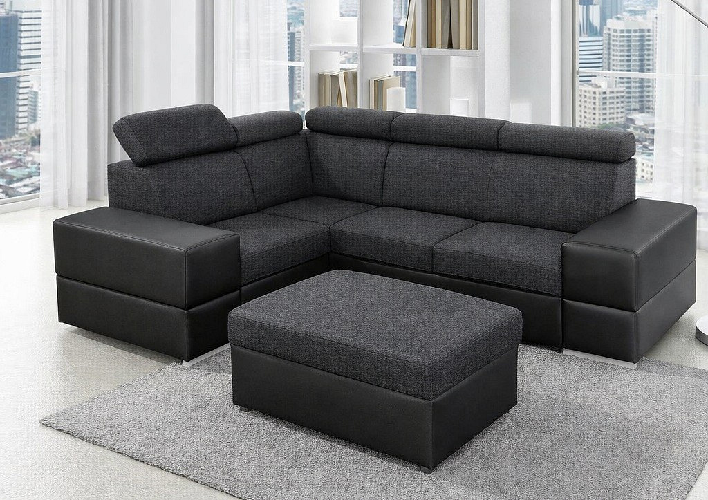 Praktickou stránku zajišťuje možnost rozložení a úložný prostor. Jednoduchým rozkladem vznikne lůžko vhodné k příležitostnému spaní. Pohodlí při sezení zajišťuje výplň sedáků, kterou tvoří kombinace vlnitých pružin s kvalitní PUR pěnou. Při odpočinku, nebo sledování televize Vám zvýší pohodlí polohovací opěrky hlavy. Sedací souprava je potažena kvalitní látkou, která je zkombinovaná s EKO kůží černé barvy.
