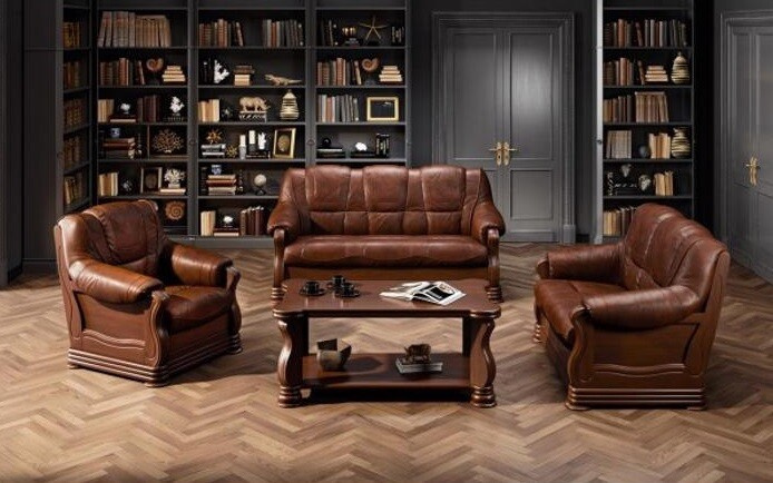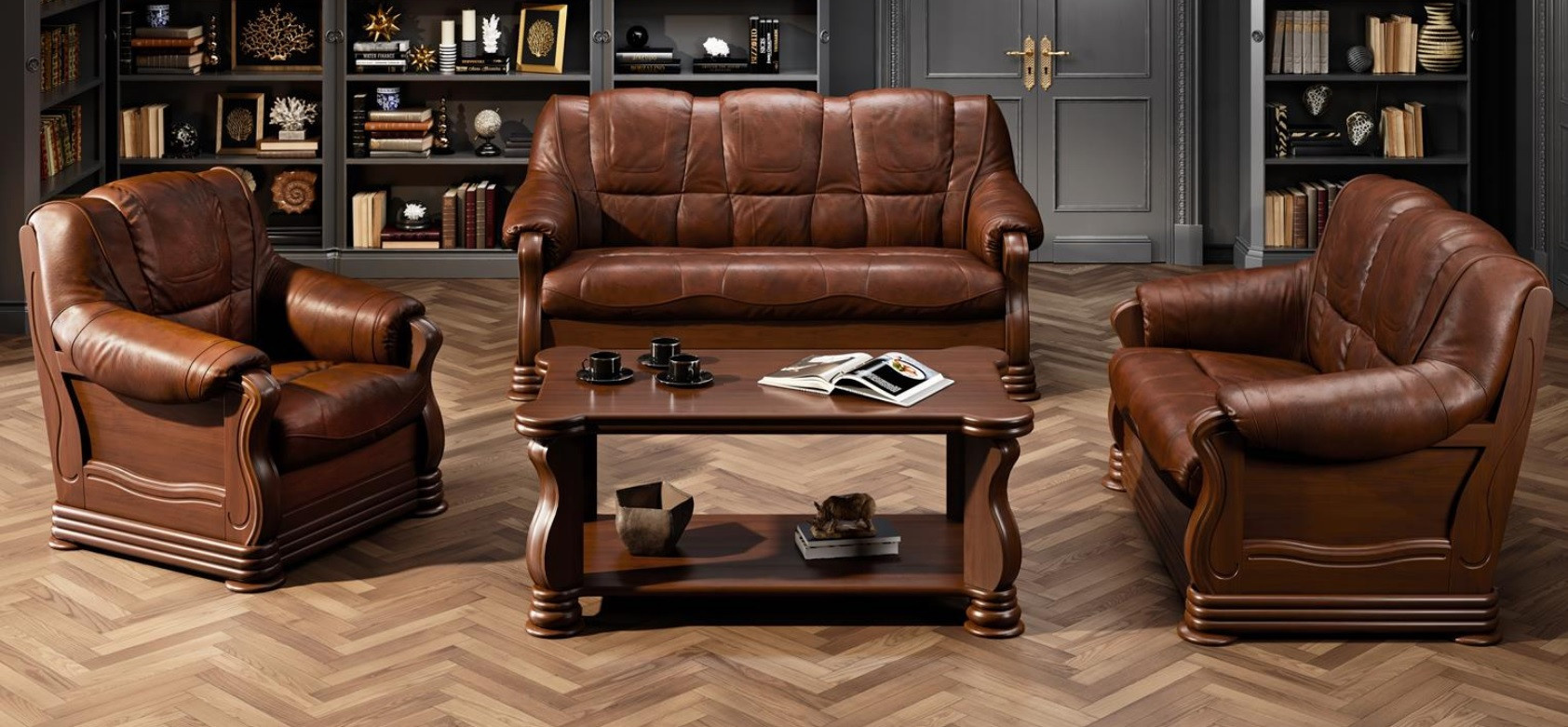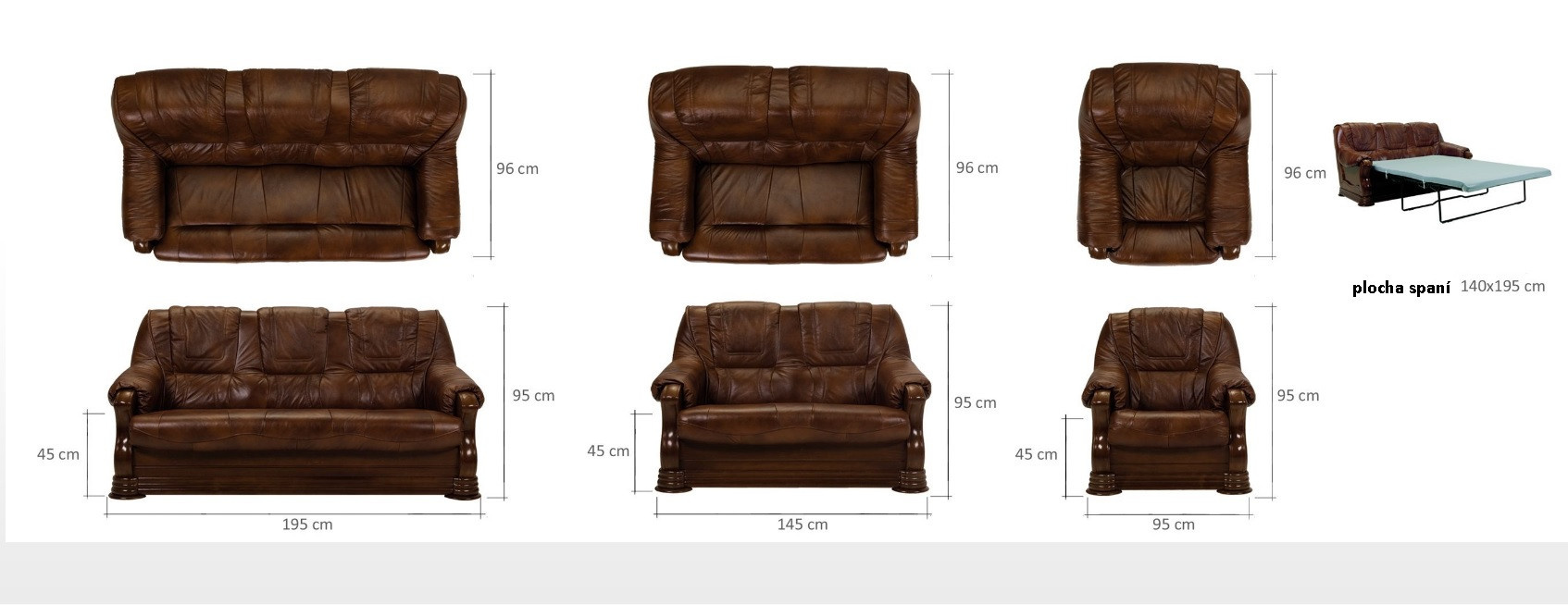 Rustikální kožená sedací souprava 3+2+1 je čalouněná pravou kůží. Možno dokoupit také taburet. Korpus je vyroben kombinací dřevotřísky a masivního dřeva. Výplně sedáku i opěry u sedací soupravy je kvalitní polyuretanová pěna. Dřevěné masivní prvky jsou mořené a lakované několikanásobnou vrstvou bezbarvého laku. Lze i jednotlivě. Pohovka 3 lze za doplatek s rozkladem ke spaní.