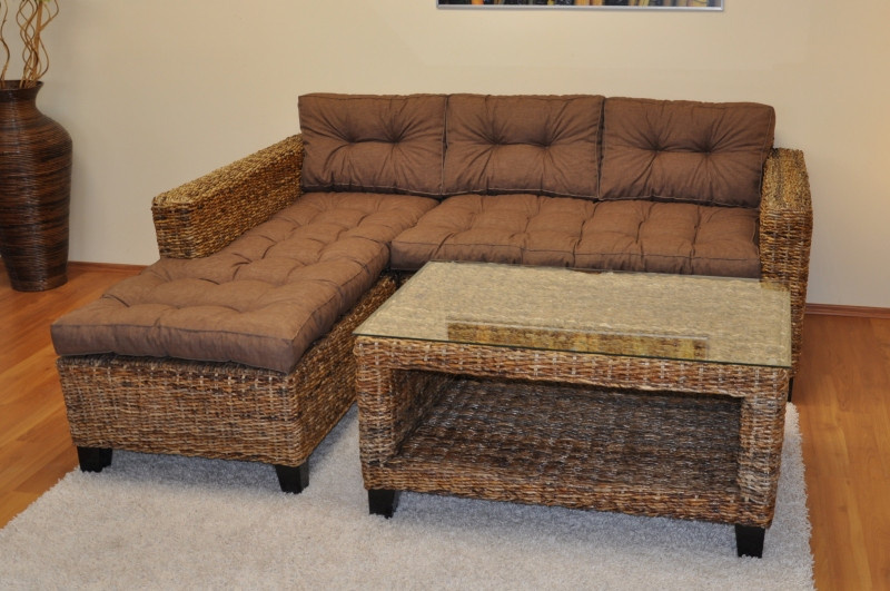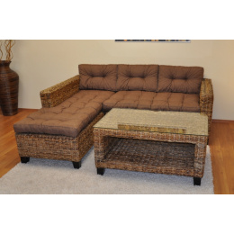 Ratanový nábytek - sedací souprava Penang s mahagonovou kostrou a výpletem z banánového listu. | Konstrukce sedací soupravy je vyrobena z masivního mahagonového dřeva, výplet je tvořen banánovým listem v přírodní barvě. Velikost pohovky je 203x180x80 cm. Nosnost pohovky je 300 kg Stolek se skleněnou deskou je velký 102x62x51 cm, Soupravu dopravíme Zdarma