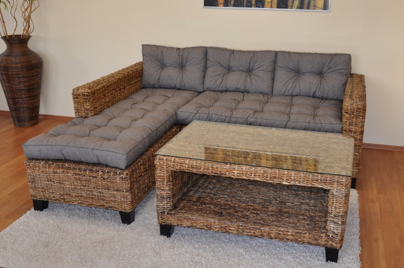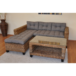 Ratanový nábytek - sedací souprava Penang s mahagonovou kostrou a výpletem z banánového listu. | Konstrukce sedací soupravy je vyrobena z masivního mahagonového dřeva, výplet je tvořen banánovým listem v přírodní barvě. Velikost pohovky je 203x180x80 cm. Nosnost pohovky je 300 kg Stolek se skleněnou deskou je velký 102x62x51 cm, Soupravu dopravíme Zdarma
