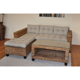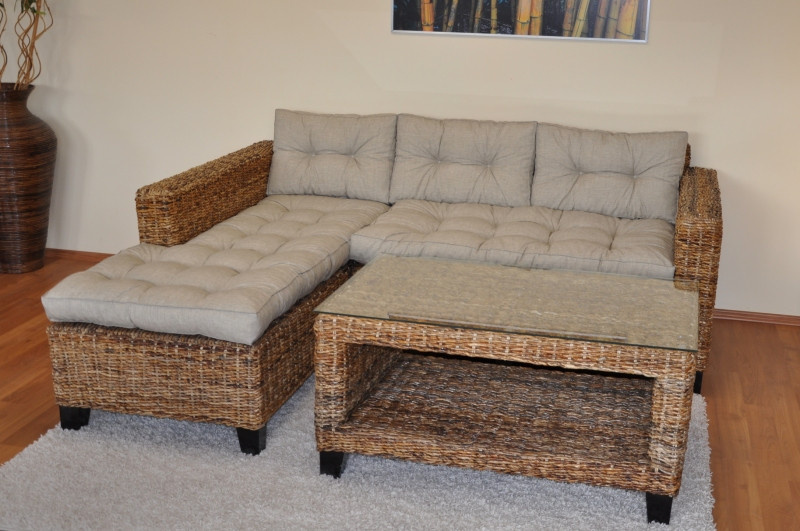 Ratanový nábytek - sedací souprava Penang s mahagonovou kostrou a výpletem z banánového listu. | Konstrukce sedací soupravy je vyrobena z masivního mahagonového dřeva, výplet je tvořen banánovým listem v přírodní barvě. Velikost pohovky je 203x180x80 cm. Nosnost pohovky je 300 kg Stolek se skleněnou deskou je velký 102x62x51 cm, Soupravu dopravíme Zdarma