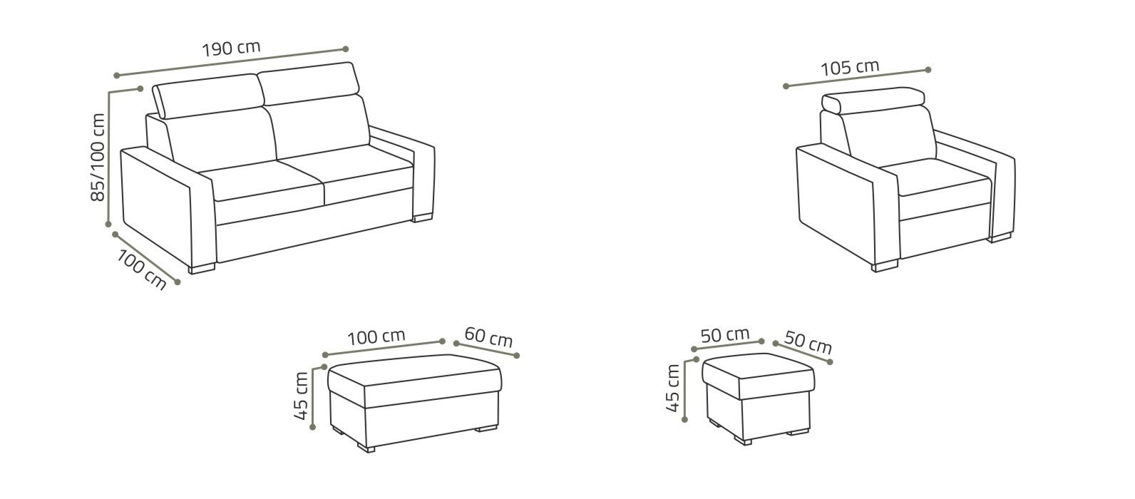 Rozměry trojsedu: 190 x 100 cm křeslo: 105 x 100 cm