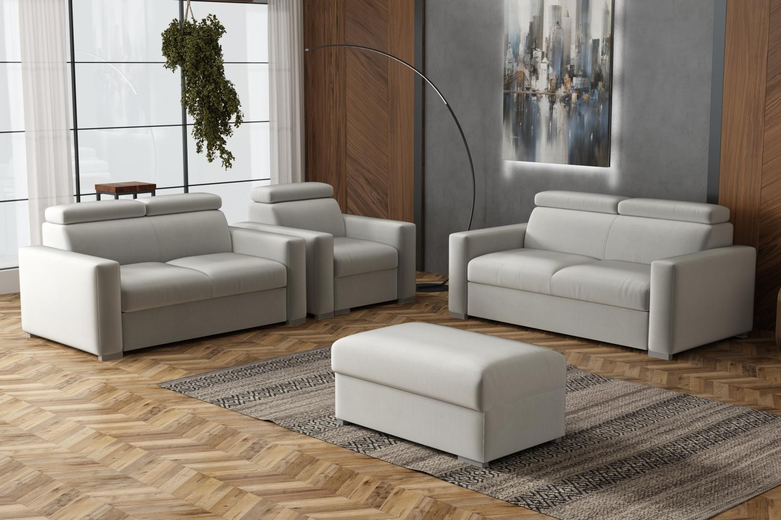 Rozměry trojsedu: 190 x 100 cm dvojsedu: 170 x 100 cm křesla: 105 x 100 cm taburet s úložným prostorem: 100 x 60 cm