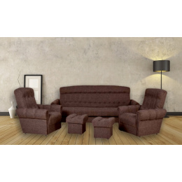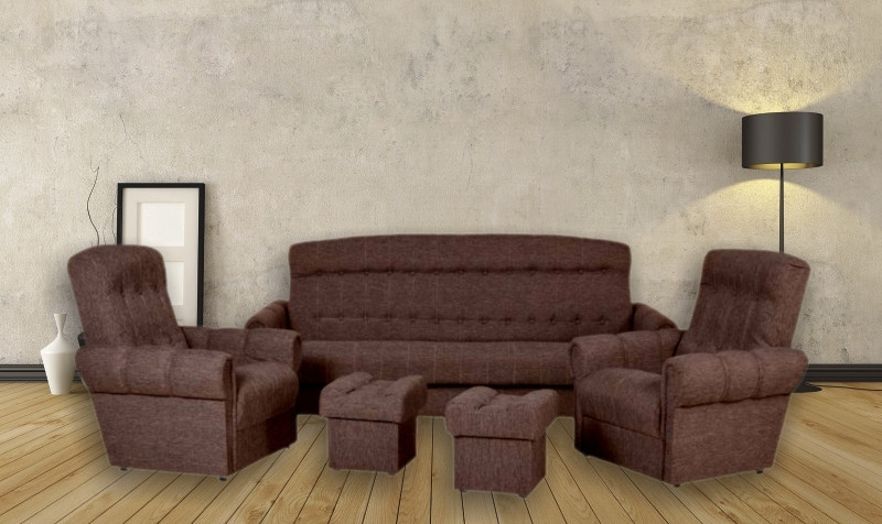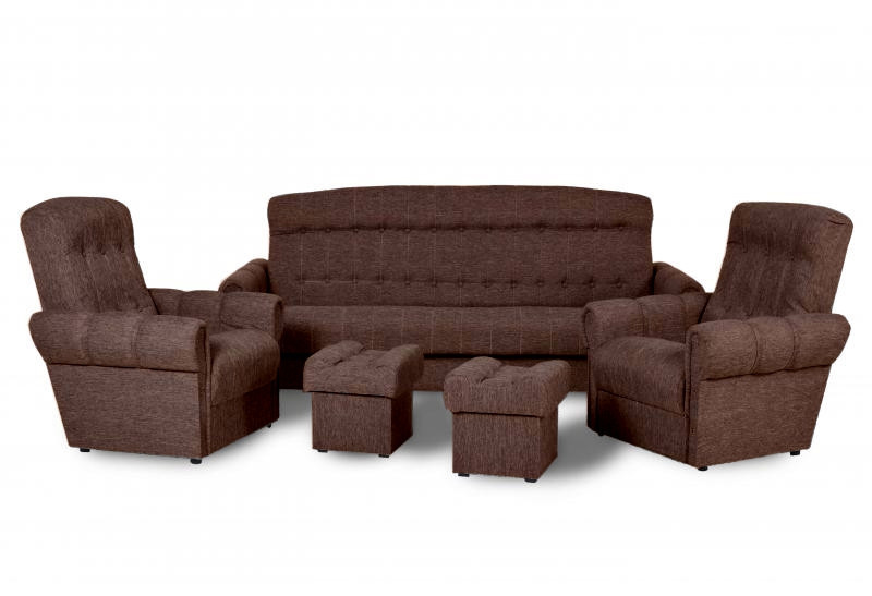 Klasická sedací souprava v hnědé barvě je velice oblíbená. Je rozkládací a součástí je praktický úložný prostor. Svou kombinací trojsedu, dvou křesel a dvou taburetů je vhodná i pro vícečlennou rodinu. Trojsed lze jednoduše rozložit stylem klik/klak a tím poslouží k občasnému přespání. Po rozložení vznikne plocha pro spaní 188 cm x 120 cm. Sedáky jsou z PUR pěny, která zajistí pohodlné sezení a vyšší opěrky ocení především starší lidé. Taburety mají také úložný prostor. Nosnost sedací soupravy do 120 kg. Dodáno v demontu.