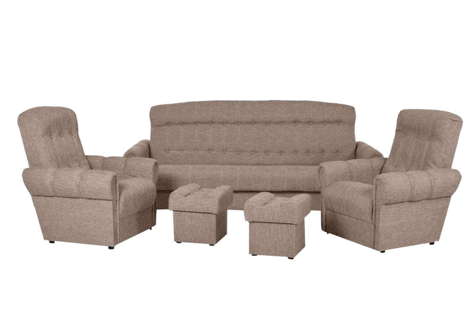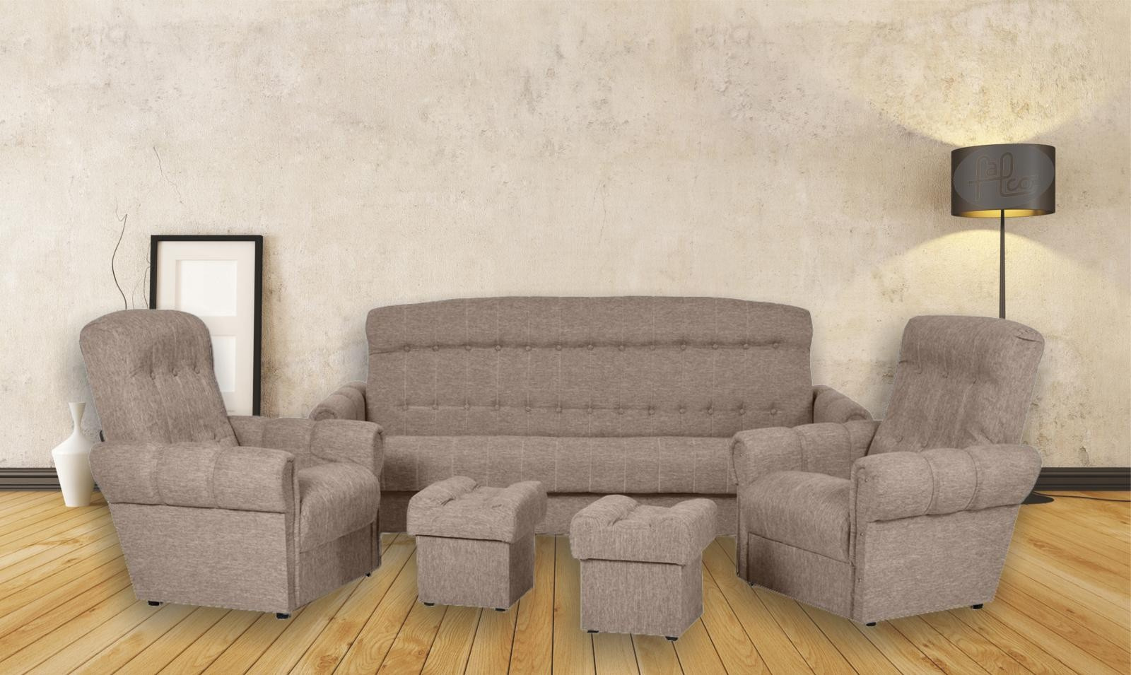 Klasická sedací souprava v šedé barvě je velice oblíbená. Je rozkládací a součástí je praktický úložný prostor. Svou kombinací trojsedu, dvou křesel a dvou taburetů je vhodná i pro vícečlennou rodinu. Trojsed lze jednoduše rozložit stylem klik/klak a tím poslouží k občasnému přespání. Po rozložení vznikne plocha pro spaní 188 cm x 120 cm. Sedáky jsou z PUR pěny, která zajistí pohodlné sezení a vyšší opěrky ocení především starší lidé. Taburety mají také úložný prostor. Nosnost sedací soupravy do 120 kg. Dodáno v demontu.