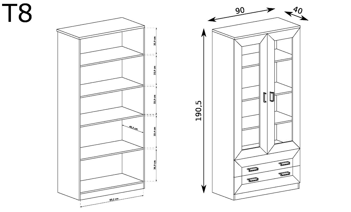 Dvoudveřová vitrína je dalším kusem nábytku z kolekce TADEUSZ. Horní část tvoří skleněná dvířka s elegantním vzorem. Spodní část je vyplněna dvěma zásuvkami, do kterých můžeme uložit např. příbory nebo ubrousky. Příborník se osvědčí v obývacím pokoji a jídelně, kde vystaví věci, které jsou pro nás nejcennější. Celou soupravu doplňují elegantní kovové úchytky.