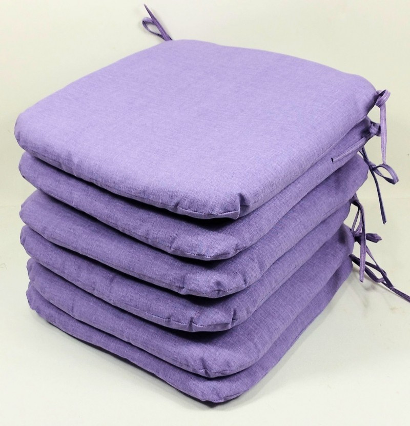 Set šesti kusů univerzálních sedáků. | Velikost sedáku je 40x40 cm. Výplň sedáku je polyesterové rouno. Sedák je opatřen tkanicemi pro snadné uchycení k židli. Tkanice jsou vyrobeny ze stejné látky jako sedáky.
