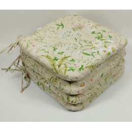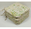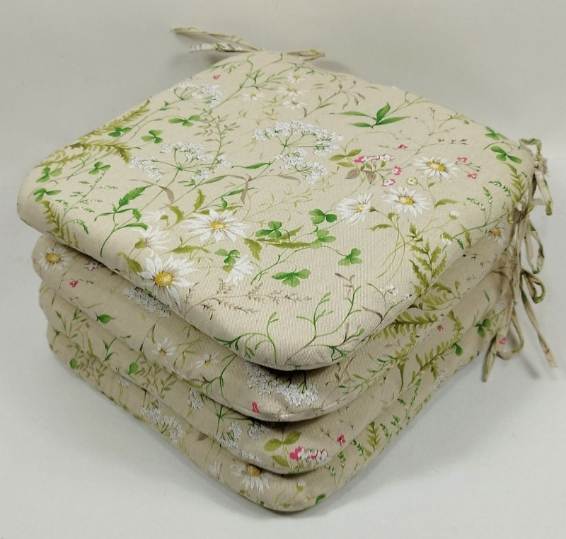 Set čtyřech kusů univerzálních sedáků. | Velikost sedáku je 40x40 cm. Výplň sedáku je polyesterové rouno. Sedák je opatřen tkanicemi pro snadné uchycení k židli. Tkanice jsou vyrobeny ze stejné látky jako sedáky.