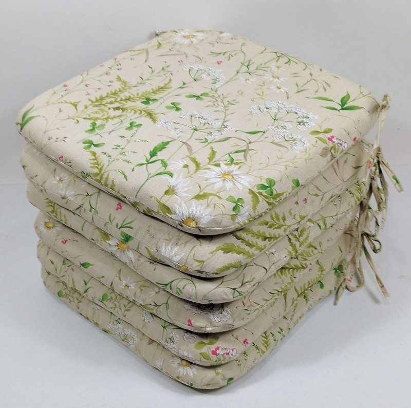 Set šesti kusů univerzálních sedáků. | Velikost sedáku je 40x40 cm. Výplň sedáku je polyesterové rouno. Sedák je opatřen tkanicemi pro snadné uchycení k židli. Tkanice jsou vyrobeny ze stejné látky jako sedáky.