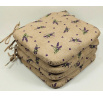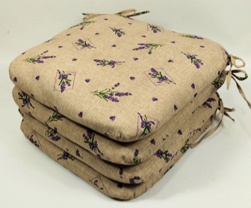 Set čtyřech kusů univerzálních sedáků. | Velikost sedáku je 40x40 cm. Výplň sedáku je polyesterové rouno. Sedák je opatřen tkanicemi pro snadné uchycení k židli. Tkanice jsou vyrobeny ze stejné látky jako sedáky.