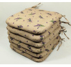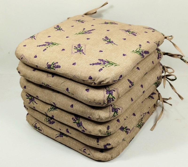 Set šesti kusů univerzálních sedáků. | Velikost sedáku je 40x40 cm. Výplň sedáku je polyesterové rouno. Sedák je opatřen tkanicemi pro snadné uchycení k židli. Tkanice jsou vyrobeny ze stejné látky jako sedáky.