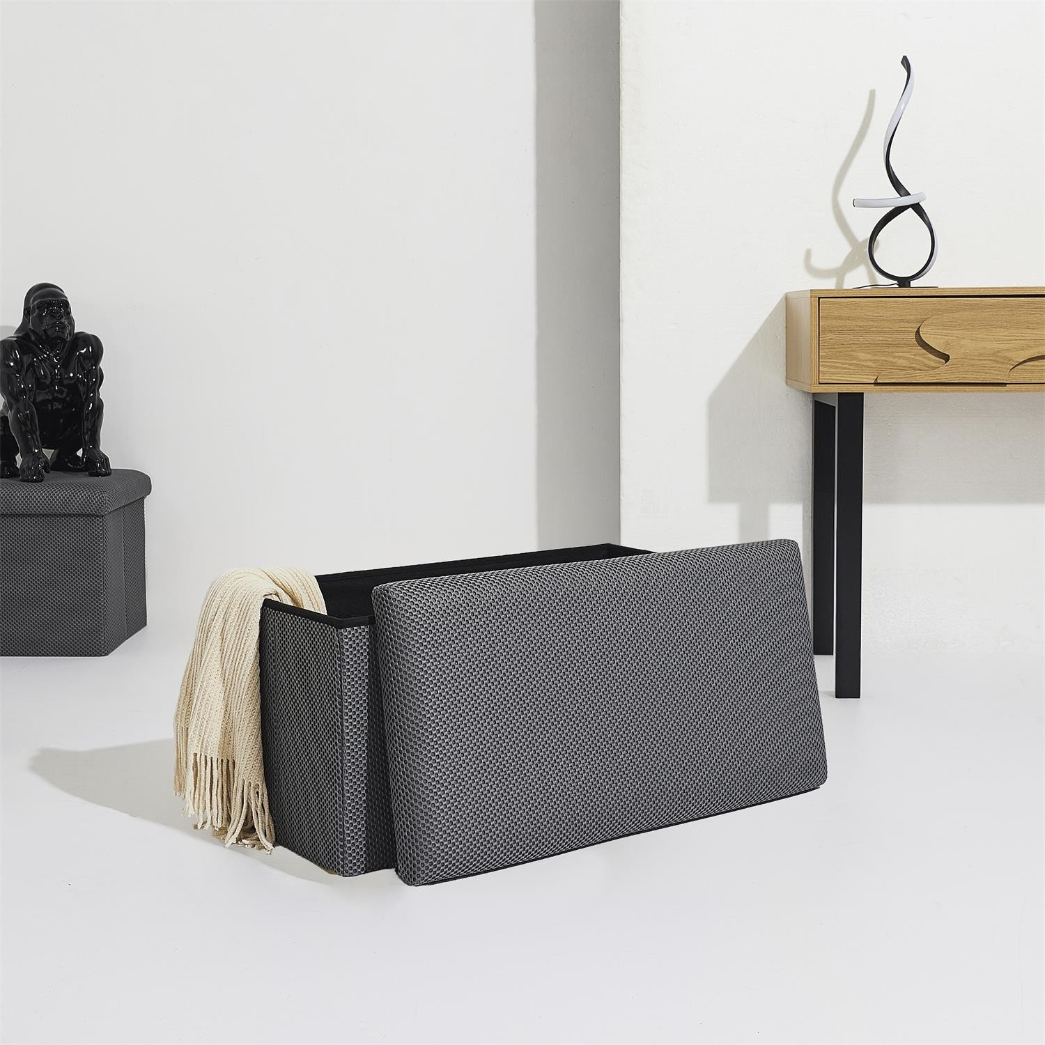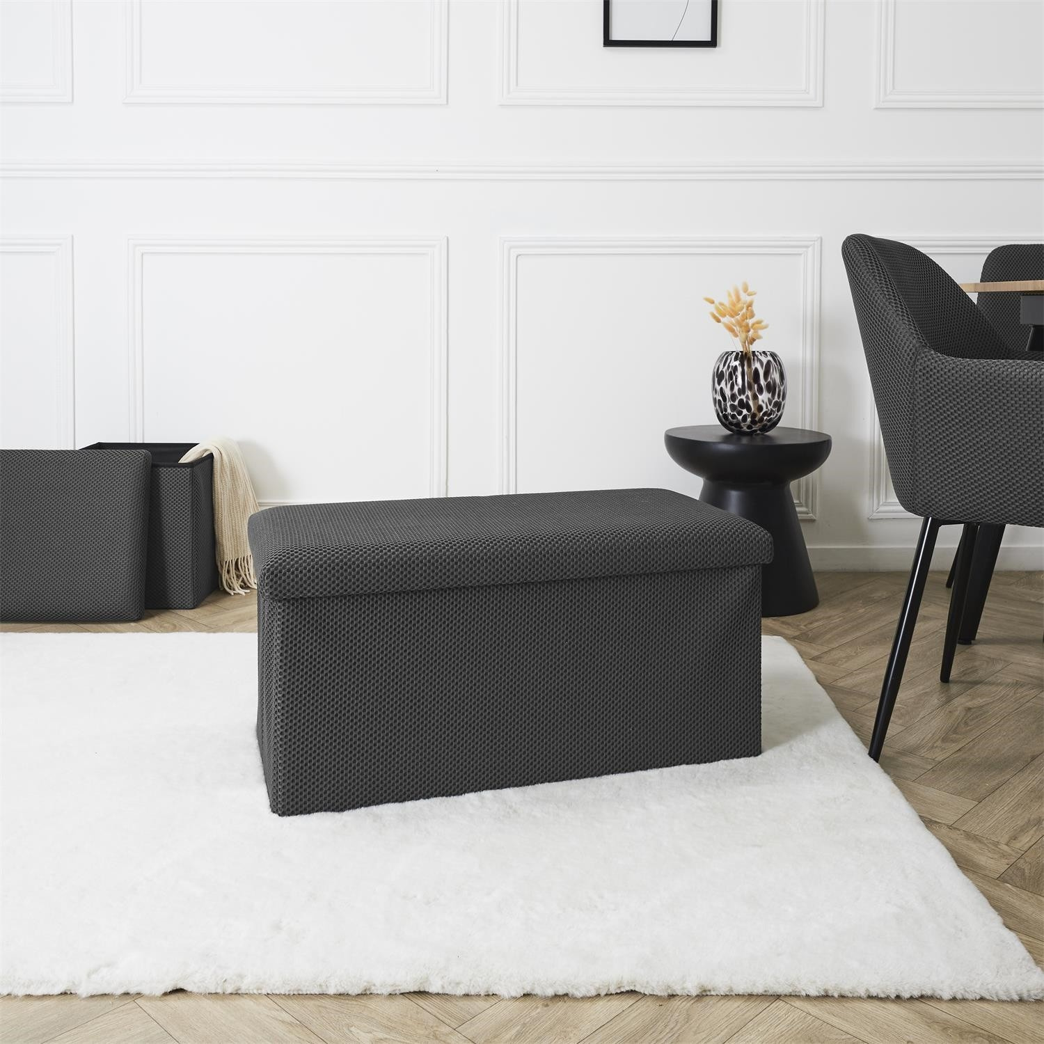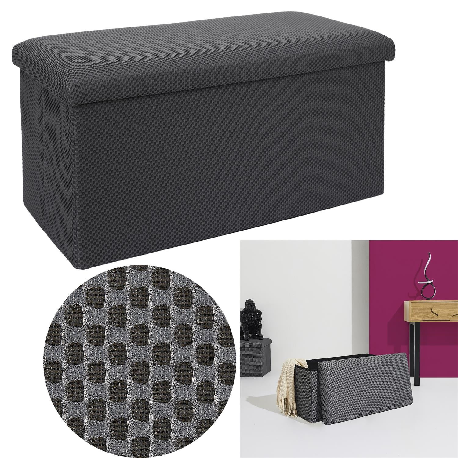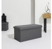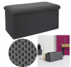 Skládací puf s úložným prostorem je nutností každého studentského bytu nebo pro osoby, které potřebují další místo k sezení a úložný prostor. Puf vyrobený z rámu z odolné MDF desky, která zaručuje maximální přípustné zatížení nábytku až do 110 kg. Puf lze složit, když ji nepoužíváme. Po rozložení nám poskytuje spoustu místa pro uložení jak menších věcí, tak i větších, jako jsou deky, boty nebo knihy. Puf byl ozdoben zajímavou trojrozměrnou tkaninou. Tkanina 100% polyester.
