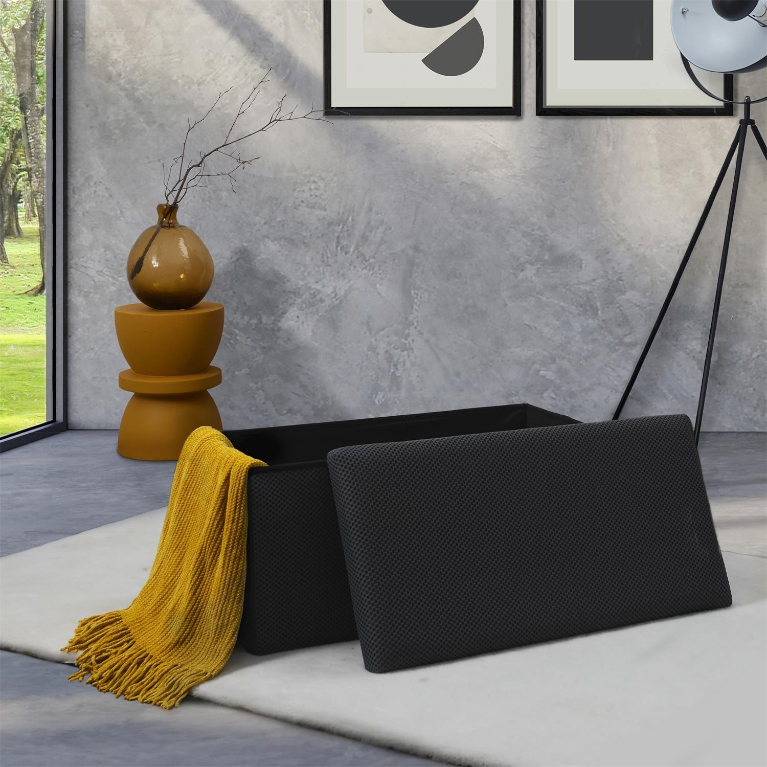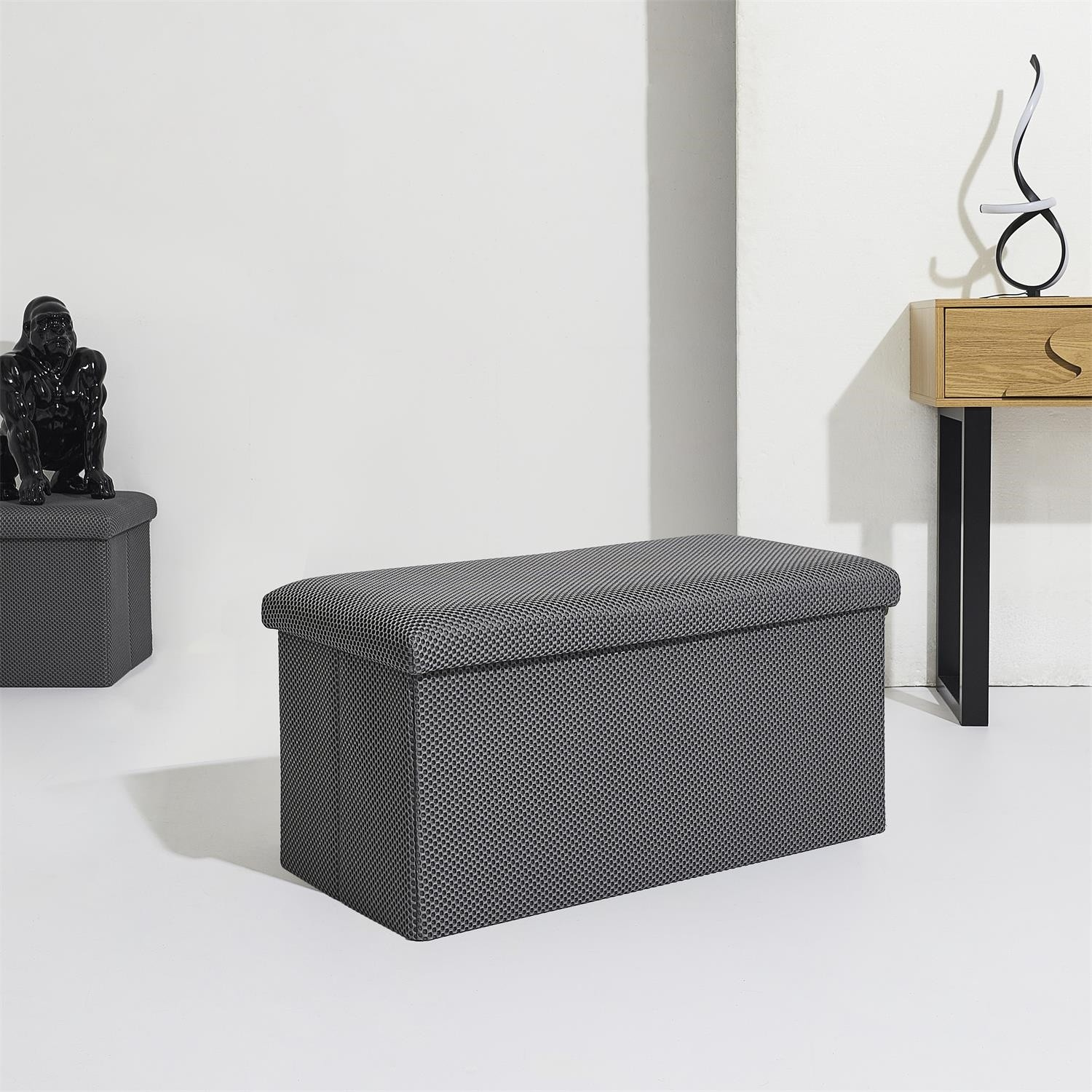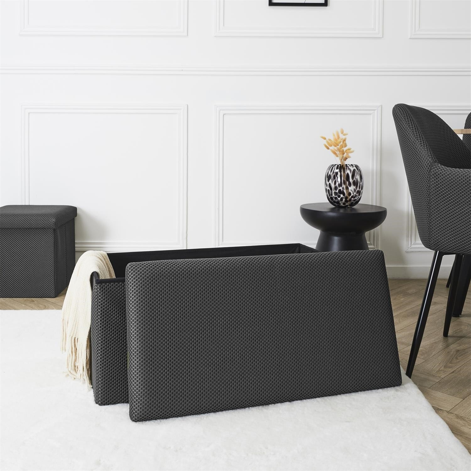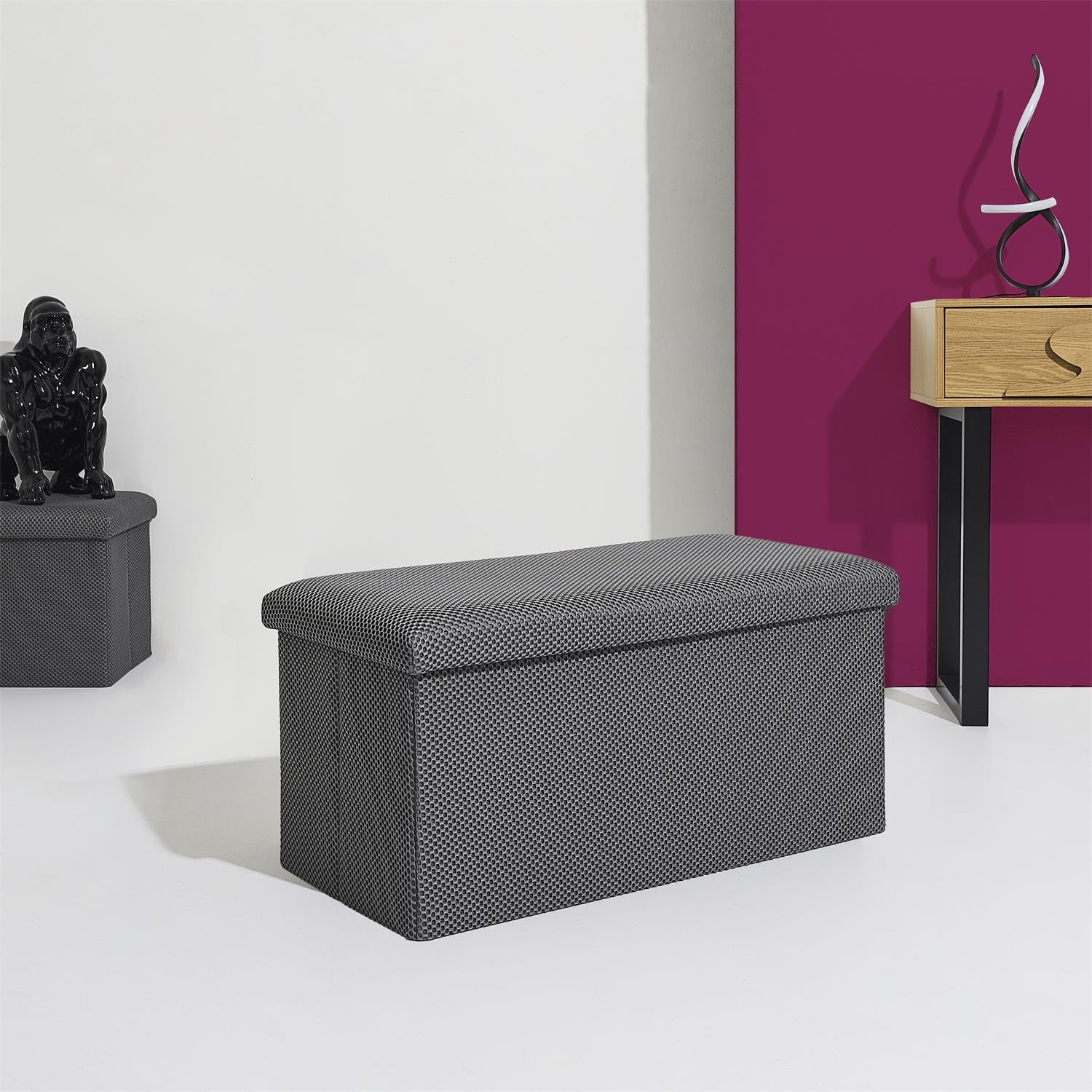 Skládací puf s úložným prostorem je nutností každého studentského bytu nebo pro osoby, které potřebují další místo k sezení a úložný prostor. Puf vyrobený z rámu z odolné MDF desky, která zaručuje maximální přípustné zatížení nábytku až do 110 kg. Puf lze složit, když ji nepoužíváme. Po rozložení nám poskytuje spoustu místa pro uložení jak menších věcí, tak i větších, jako jsou deky, boty nebo knihy. Puf byl ozdoben zajímavou trojrozměrnou tkaninou. Tkanina 100% polyester.