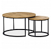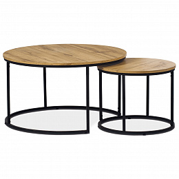 Set dvou konferenčních stolků kombinuje desky z MDF s dekorem divokého dubu a pevnou kovovou podnož v černém laku, která zajišťuje stabilitu a dlouhou životnost. Stolky mají kulatý tvar s hladce opracovanými hranami a rozdílnou výškou, což umožňuje jejich praktické uspořádání v prostoru, například zasunutí menšího stolku pod větší. Povrch desek je odolný vůči běžnému opotřebení a snadno se udržuje, což přispívá k jejich funkčnosti v moderních interiérech. Díky kombinaci přírodních odstínů hnědé a industriálního kovu se hodí do různých stylů zařízení od rustikálního po industriální. Rozměry a stabilní provedení umožňují využití stolů jako praktického doplňku obývacích pokojů či kanceláří. Menší stolek je s průměrem 50cm, výškou 40cm a světlou výškou 37cm.