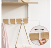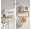 Sada dvou nástěnných polic kombinuje MDF desky v dekoru dubového dřeva s pevnými kovovými nosnými vzpěrami v černé barvě, které zajišťují stabilitu a dlouhou životnost. Police nabízejí praktický odkládací prostor a jsou doplněny o čtyři kovové háčky na každé polici, vhodné pro zavěšení klíčů, drobných doplňků nebo kuchyňského náčiní. Povrch desek je upraven v odstínech přírodního dřeva, což přispívá k příjemné atmosféře interiéru. Kompaktní rozměry 50x24x27 cm umožňují snadné umístění v chodbě, kuchyni či pracovně. Díky kombinaci materiálů se snadno udržují a jsou vhodné pro různé typy interiérů.