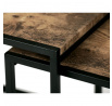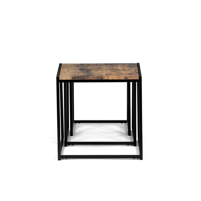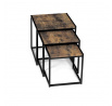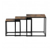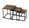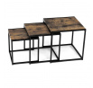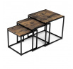 Set 3 ks přístavných nebo odkládacích stolků přinese do Vašeho domova praktičnost, variabilitu, ale také industriální šarm. Stolky můžete rozmístit jednotlivě po interiéru, kde Vám vytvoří zajímavé odkládací prvky v různých výškových hladinách. A nebo společně povytažené, kde vytvoříte velkou obdélníkovou stupňovitou odkládací plochu. Velkou výhodou je možnost zasunutí stolků do sebe, což oceníte při úklidu, skladování nebo při potřebě většího prostoru. Čtvercové desky z MDF v dekoru staré dřevo harmonicky doplňují černá kovová konstrukce, která tvoří rovněž nohy a celkově stolky zpevňuje. Stolek jistě zaujmou nejen svým nadčasovým designem, ale i variabilitou a praktičností. Desky májí rozměr 35 x 35 x 35 , 40 x 40 x 40 a 45 x 45 x 45 cm, tloušťku 1,5 cm. Konstrukce je čtvercového průřezu, na spodních plochách opatřená plastovými kluzáky. Nosnost jednotlivého stolku je do 15 kg.